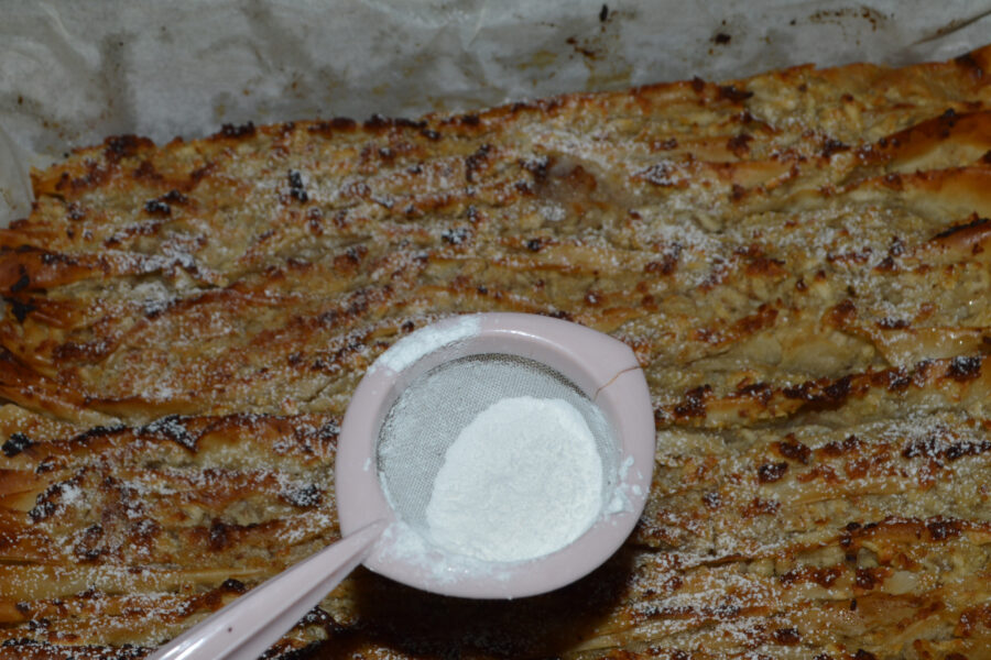 - After removing the pie from the oven, sprinkle with powdered sugar while it is still hot, then cover with a towel and leave for 10-15 minutes. Then you can cut and serve.