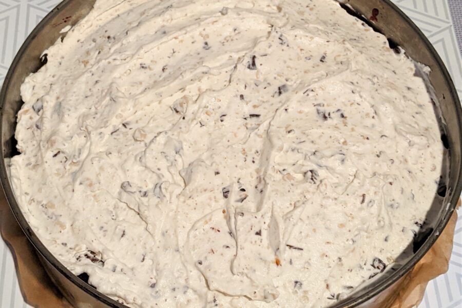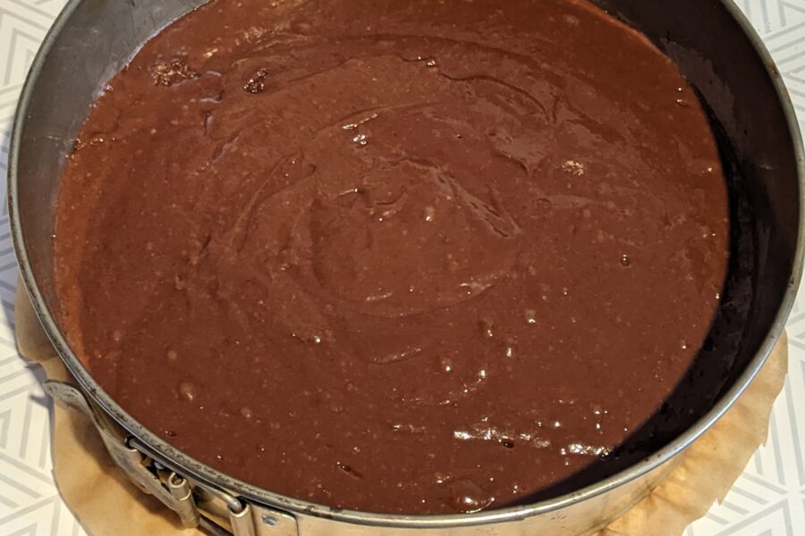 - Line the pan (24 cm) with baking paper, pour in the mixture, and bake in the oven at 180° for 40 minutes.