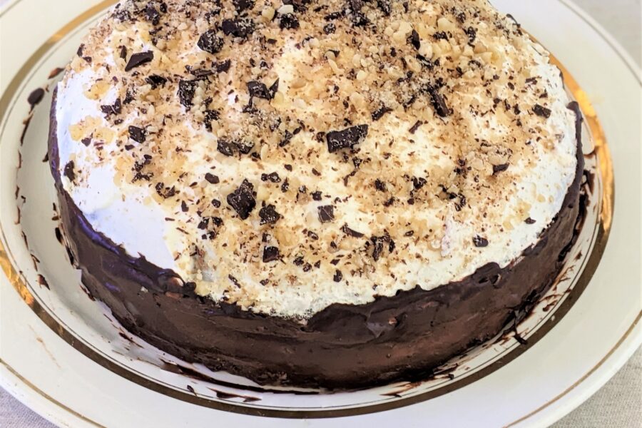 - Cover the cake with the remaining cream and sprinkle with walnuts. Refrigerate the cake for several hours. Remove the sides and bottom of the pan from the cake and transfer the cake to a platter directly with the paper.