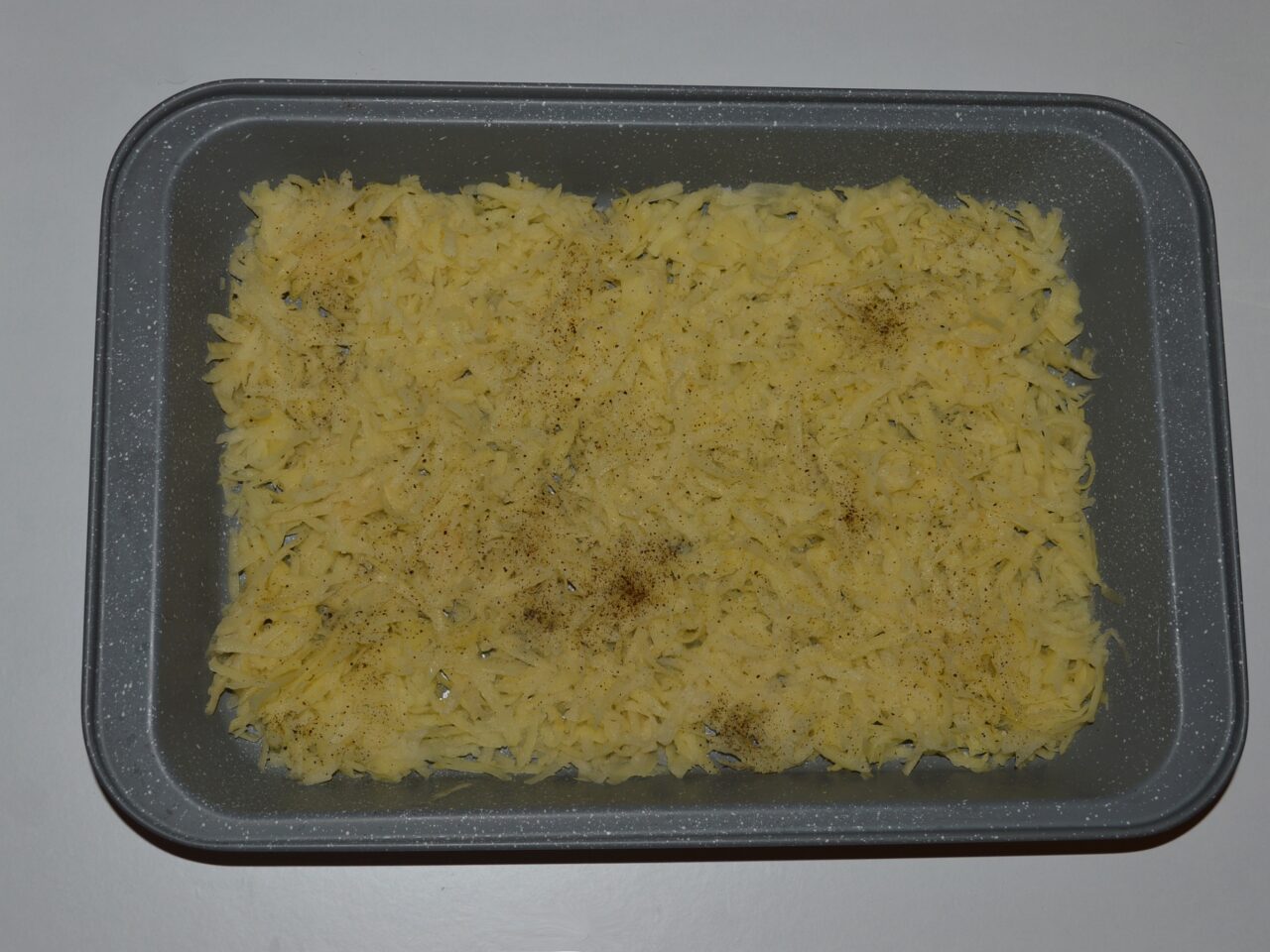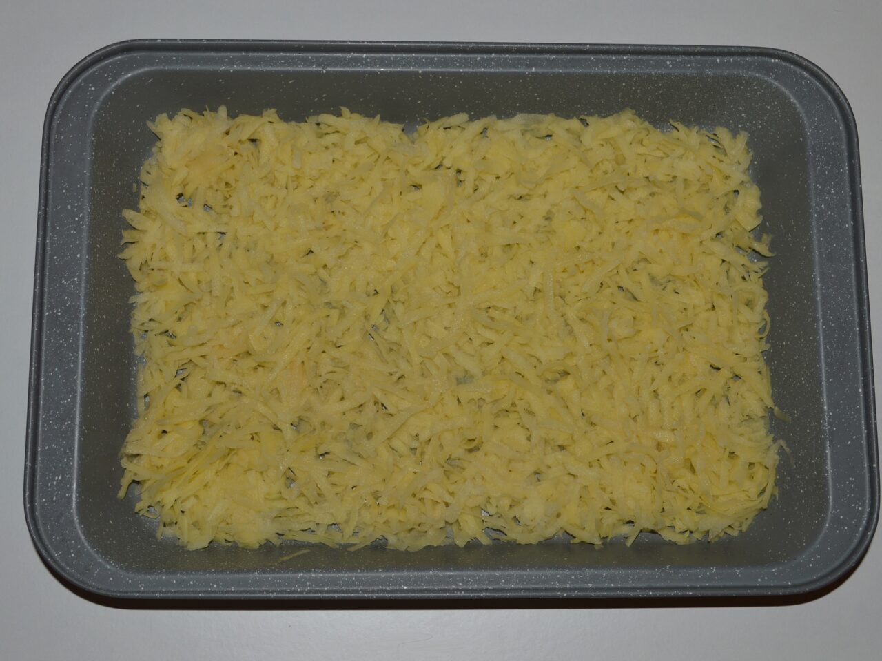 - Peel the potatoes, wash them, and grate them using a coarse grater. Drain the liquid from the grated potatoes well and transfer them to a baking tray in an even layer. I used a 37 cm (15-inch) tray.