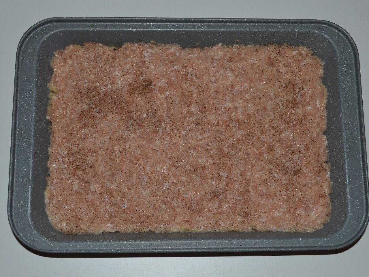 - The second layer will be minced chicken, also sprinkled with salt and pepper.