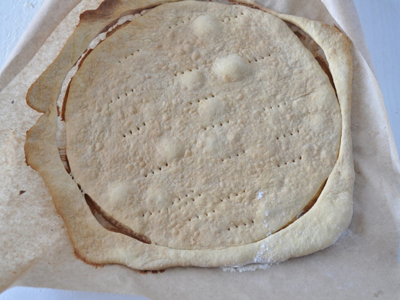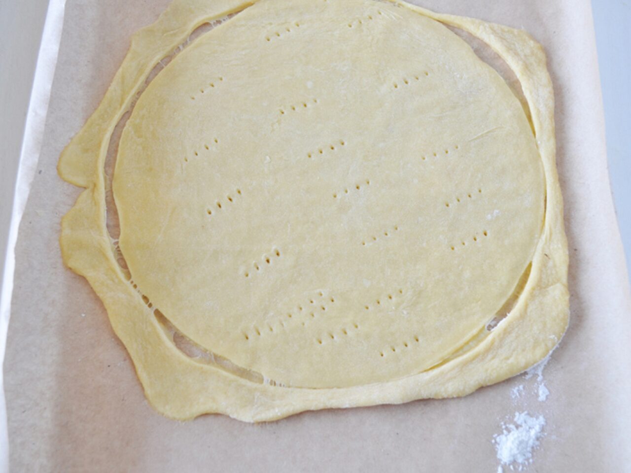 - Place a piece of dough on parchment paper and roll it out with a rolling pin. Place a regular plate on top. Cut a circle using a pizza cutter. Then use a fork to prick it.