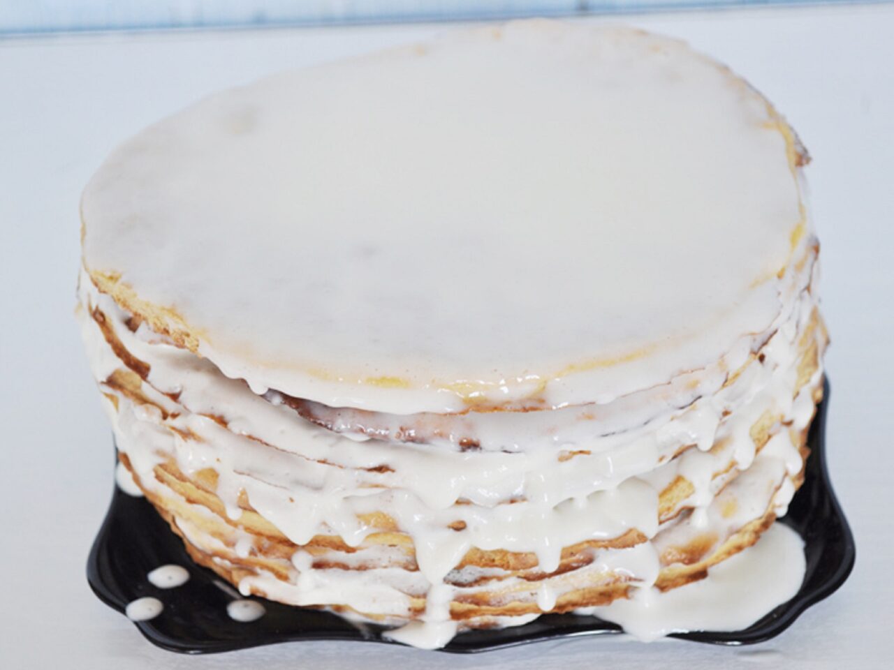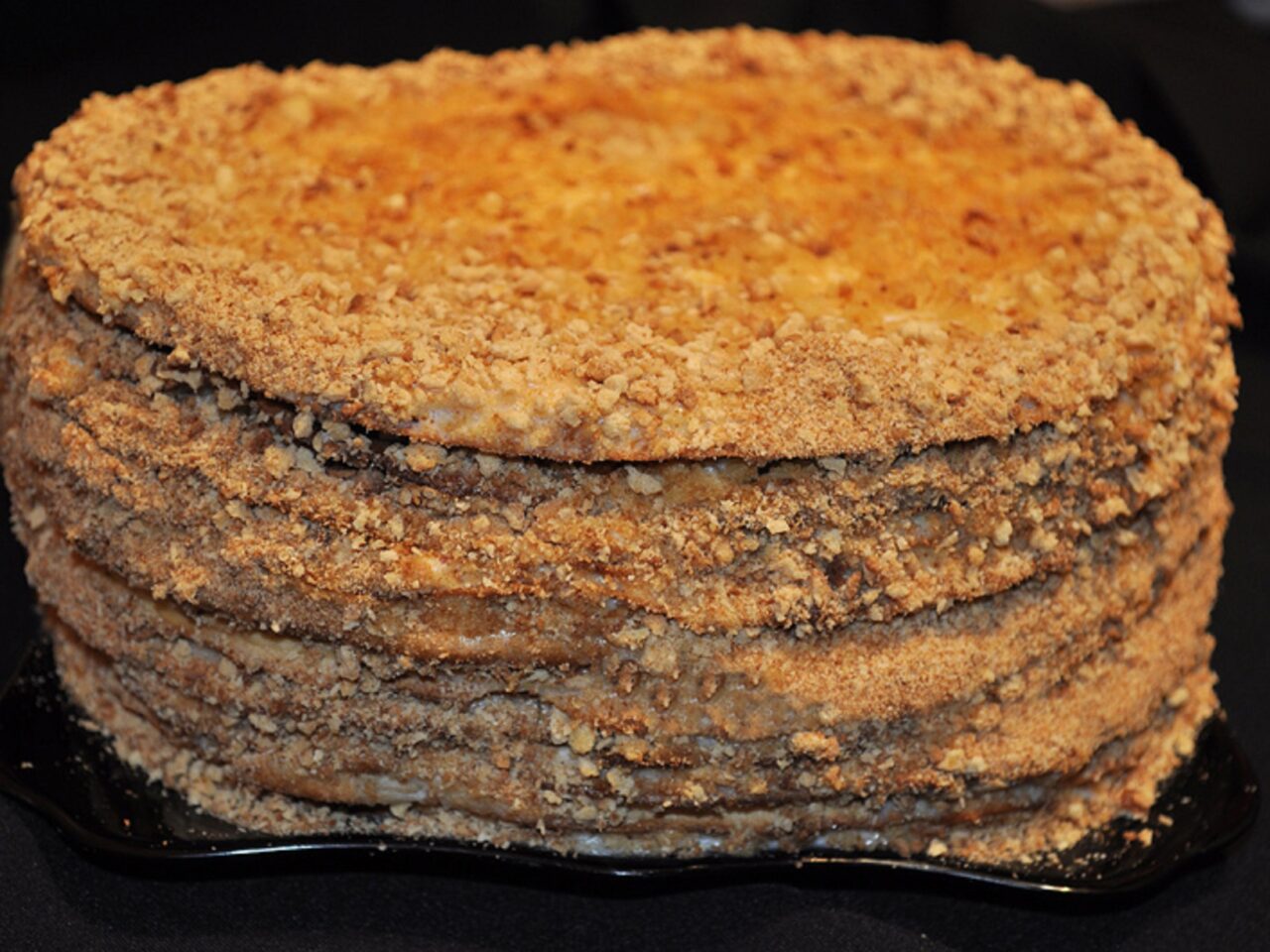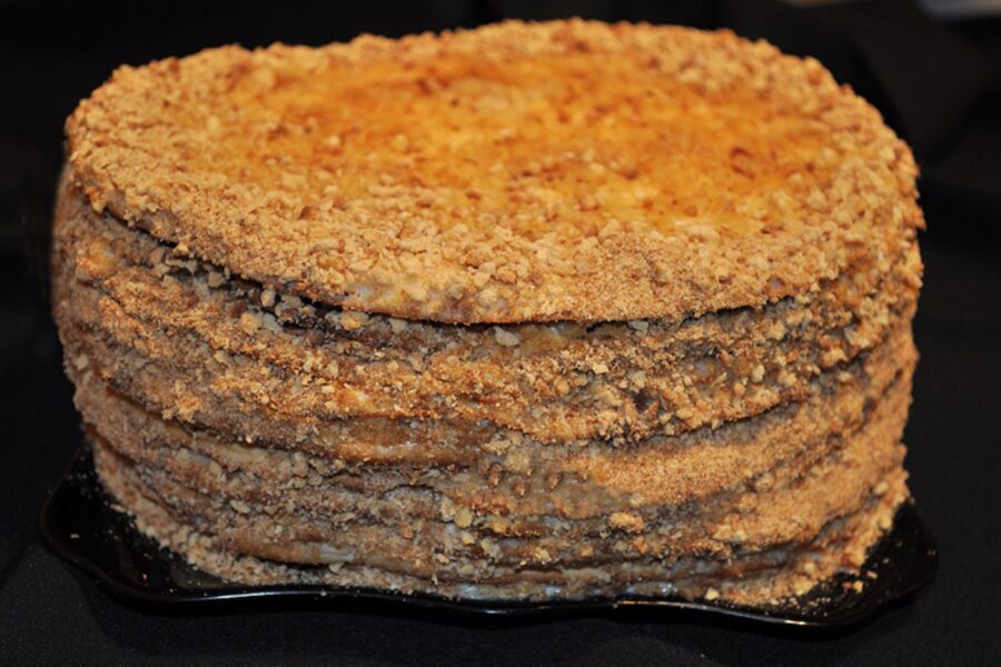 - Place the cake scraps in the bowl of a blender and grind them into crumbs. Sprinkle the crumbs over the top and sides of the cake. The Medovik cake is ready!