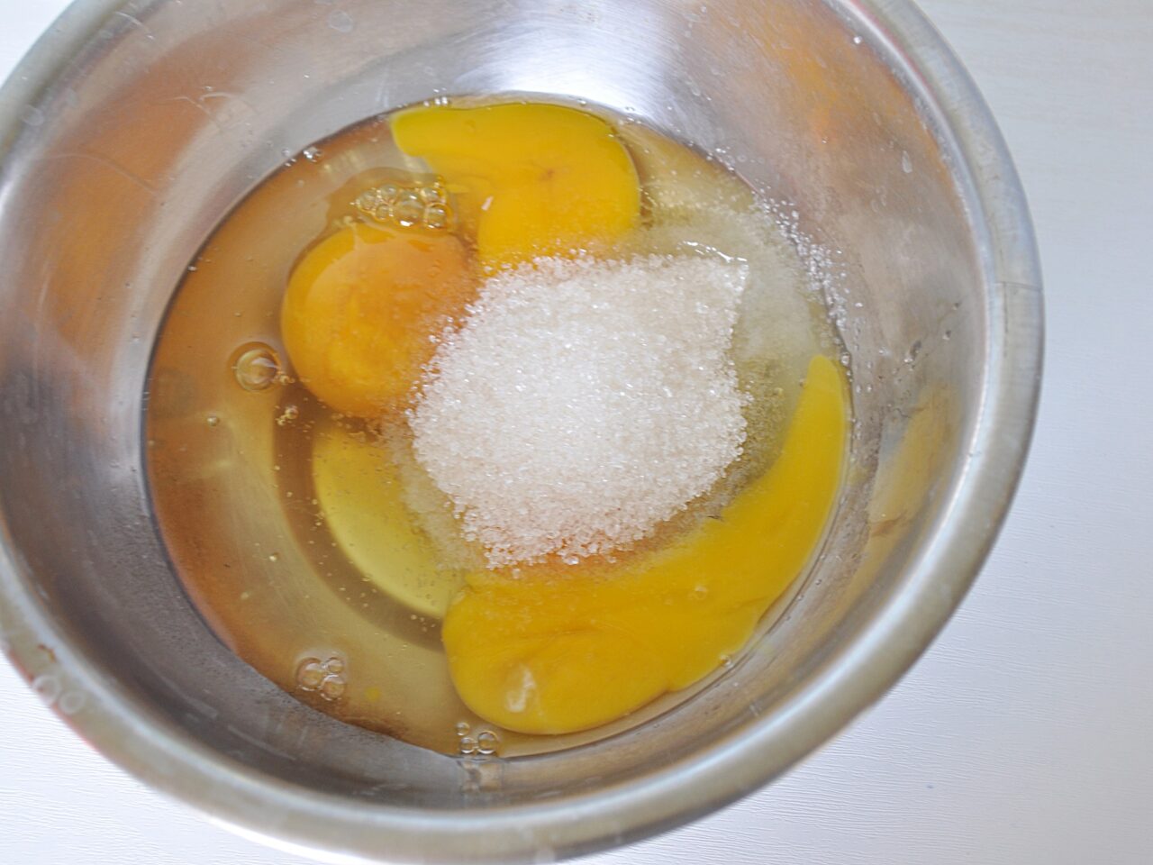 - Break the eggs into a large bowl and add sugar to them.