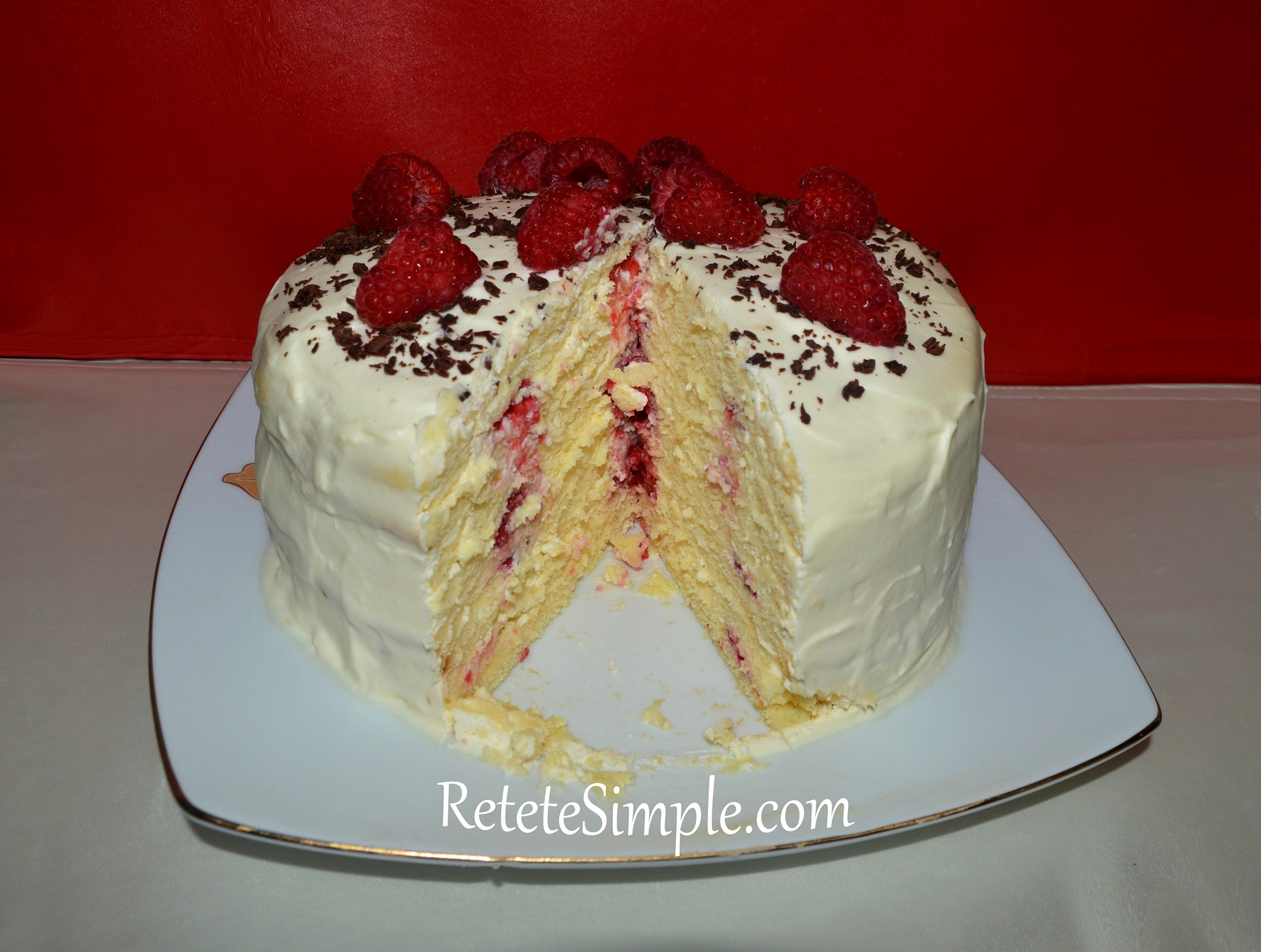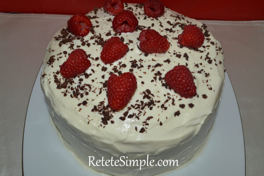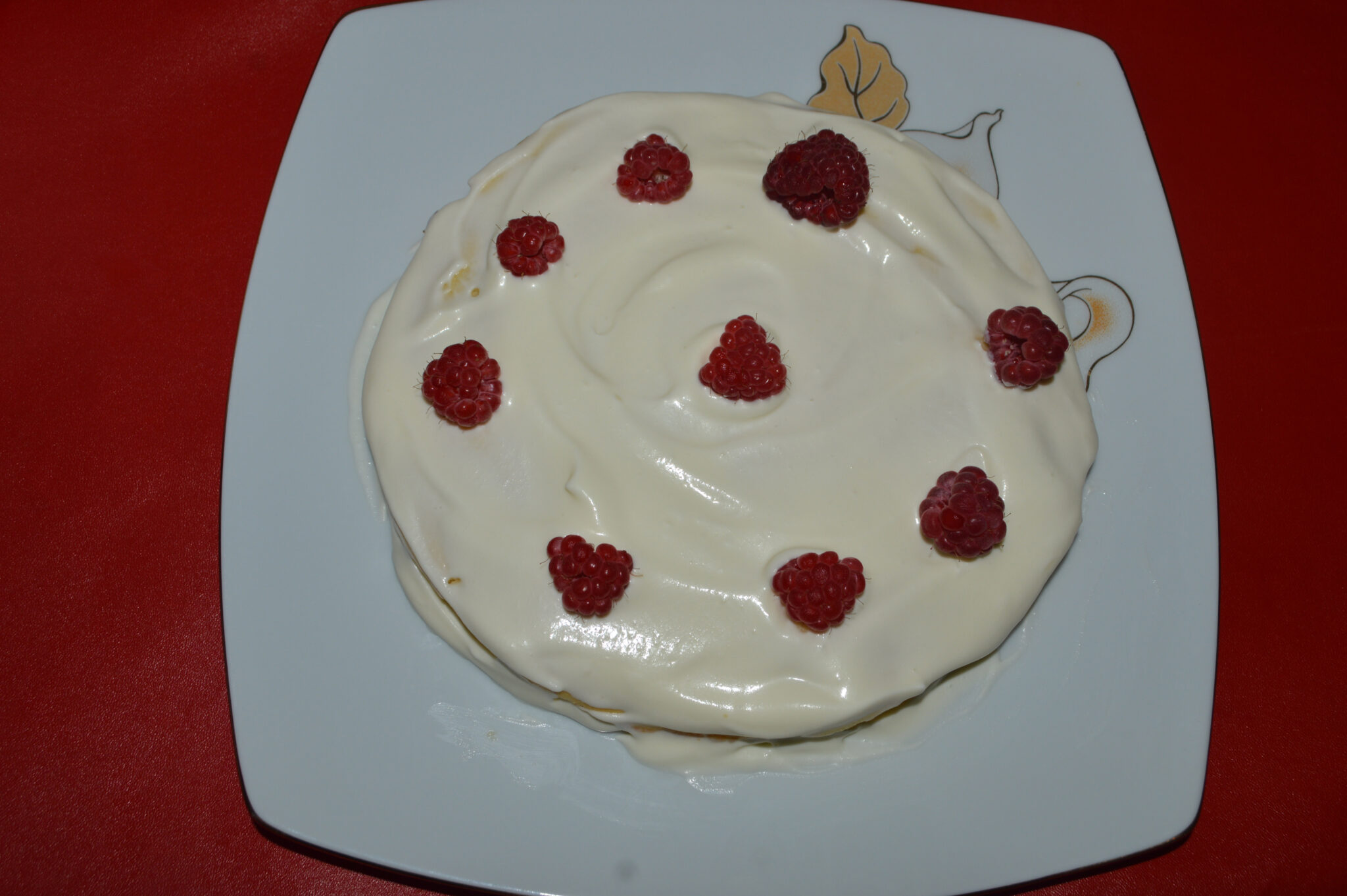 - Grate some dark chocolate and sprinkle it over the cake, then arrange the raspberries on top. You can decorate it however you like; if you have other berries or strawberries, you can use them. Put the cake in the refrigerator overnight.