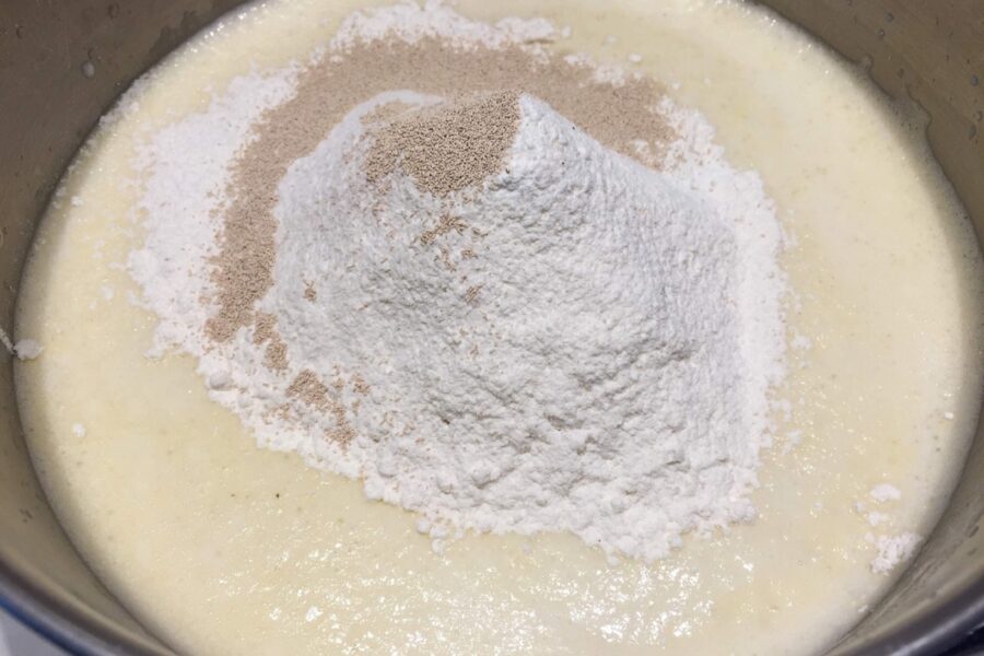 - Pour flour and dry yeast into the resulting mixture (if ” live” yeast was not used).