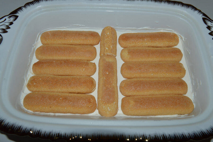 - Add the second layer of ladyfingers, also dipped in milk first.