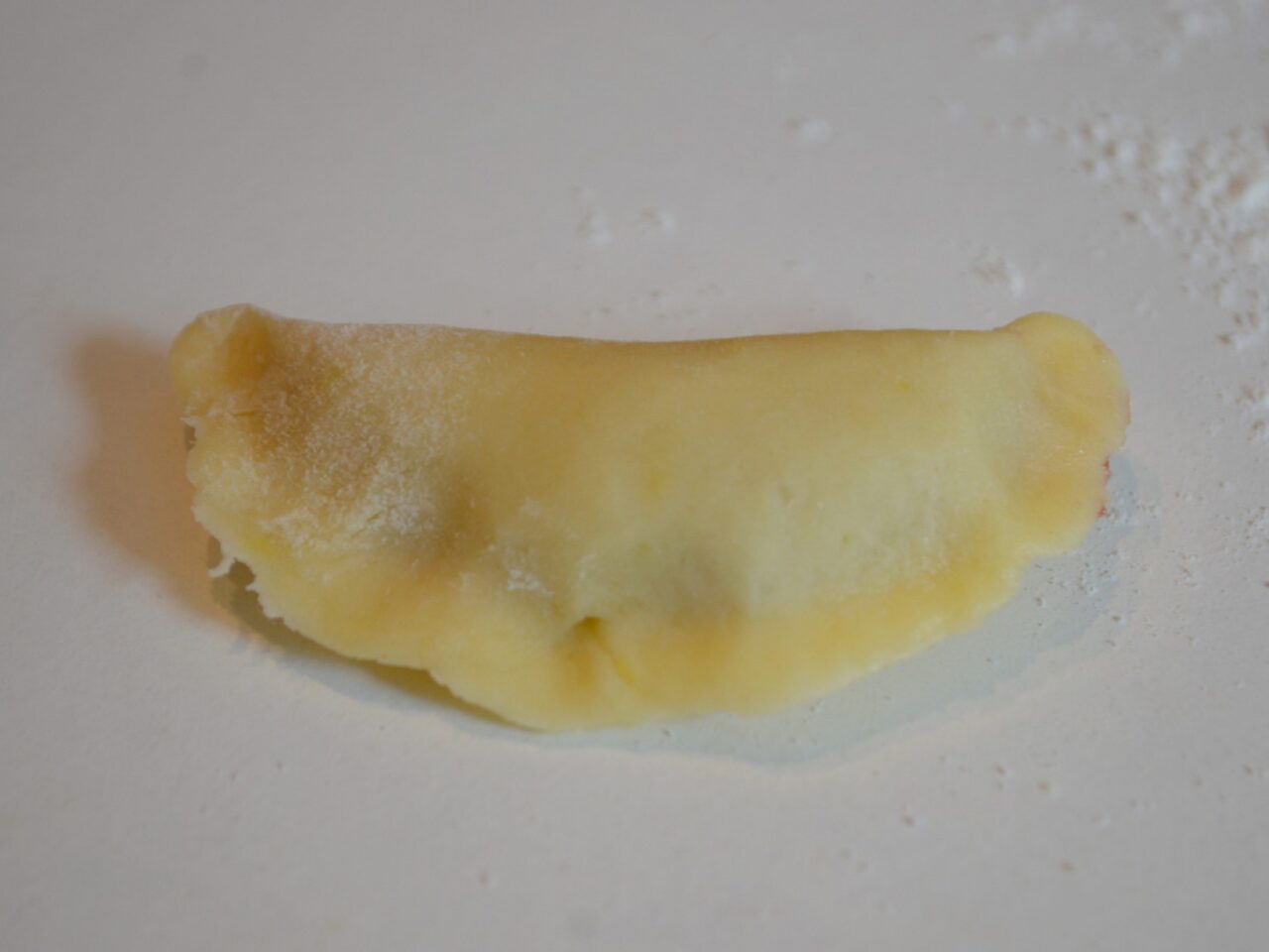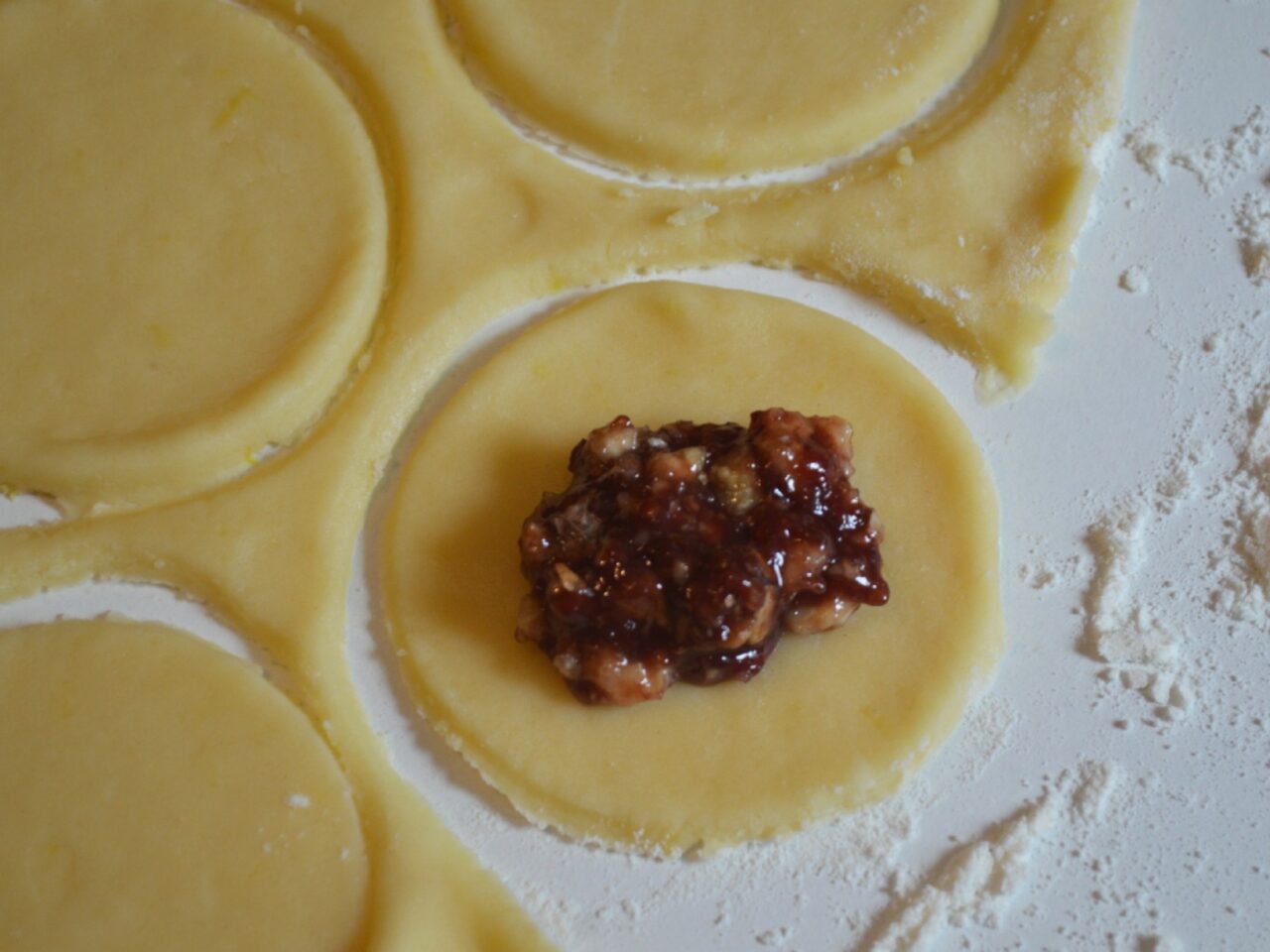 - Close the edges of the circle with the filling to form a crescent. Repeat with the remaining circles of dough, then roll out the remaining dough again and cut out circles. I ended up with 14 crescents.
