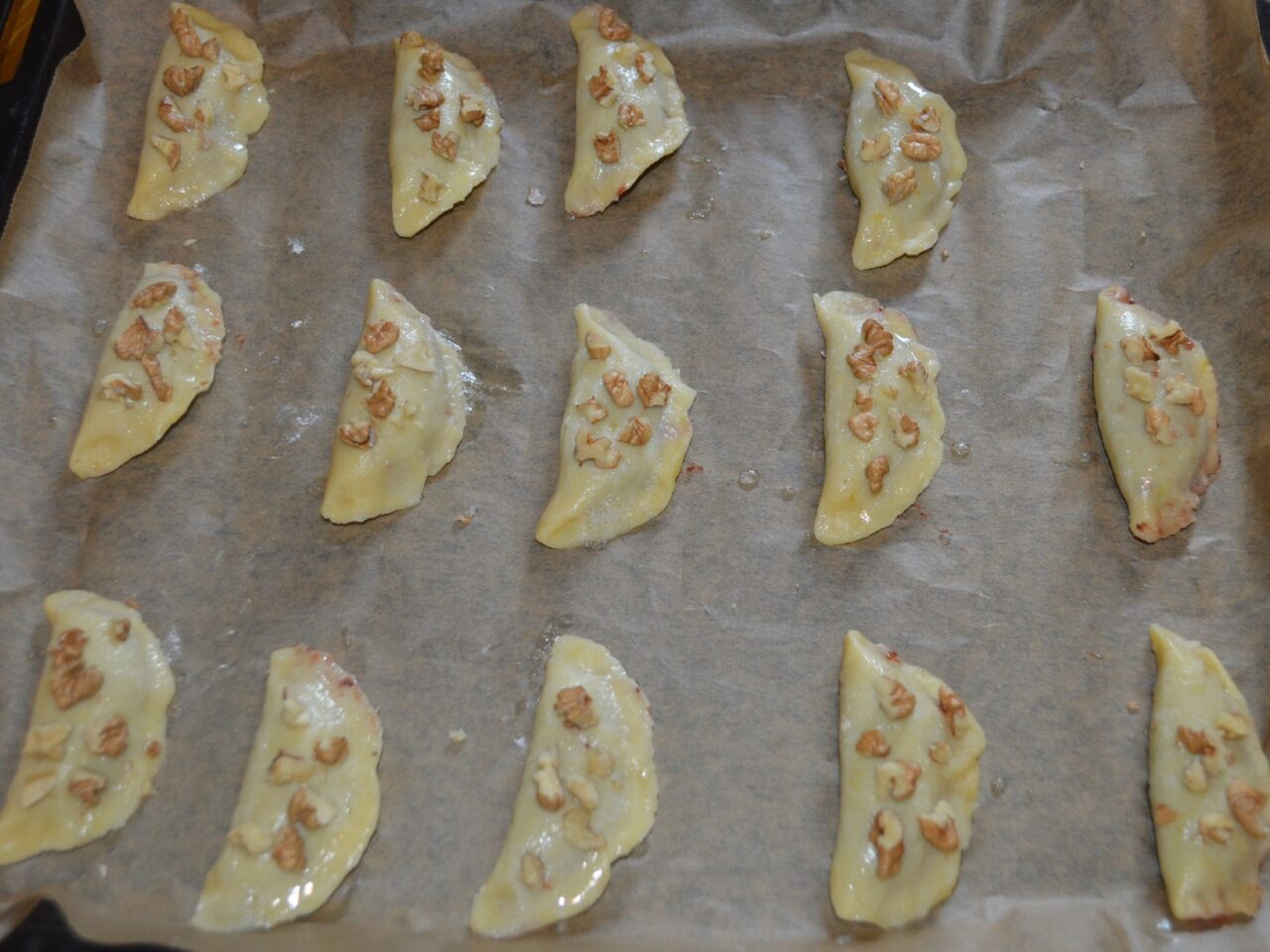 - Chop the walnuts finely with a knife and arrange small pieces of walnut on each crescent. Bake in the oven at 170 degrees for 15 minutes.