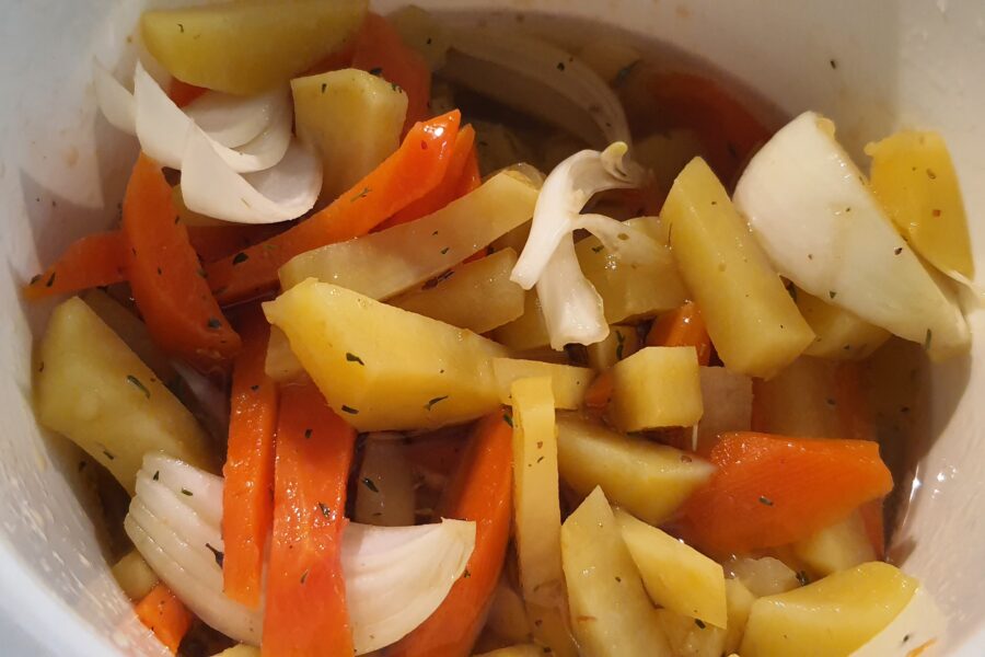 - Peel the onion, slice it, sprinkle it with the dried herb mix or rosemary, add it to the vegetables and toss to combine.