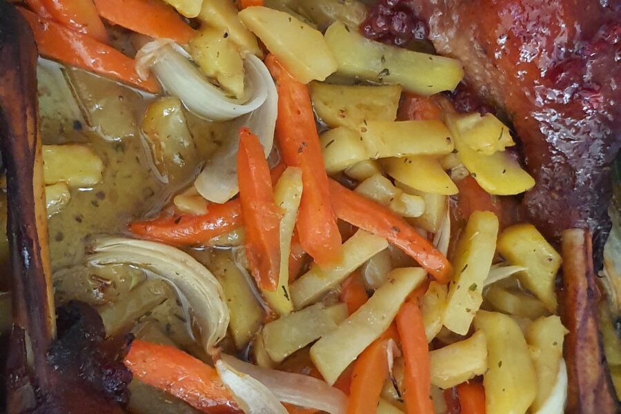 - Arrange the duck legs and the vegetables together in a baking dish.