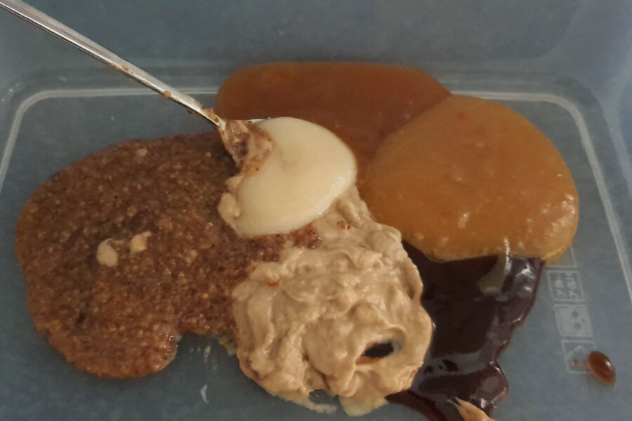 barbecue sauce, walnut mustard, plain mustard, cheese sauce with mustard and orange, honey, and two packets of sweet and sour sauce from McDonald’s.