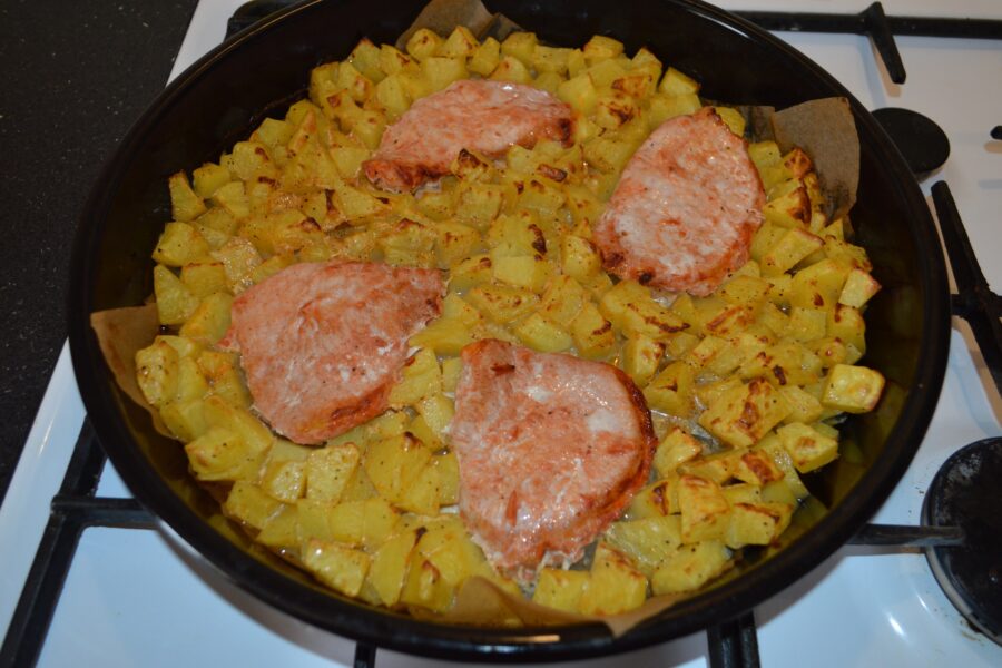 - Line the baking tray with baking paper, place the potatoes and pork chops on it.