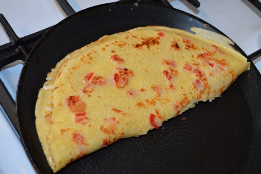 - Cover with the other half of the pancake. Leave on the heat for another 30-40 seconds until the cheese melts. Then transfer the pancake to a plate and repeat with the rest of the mixture.