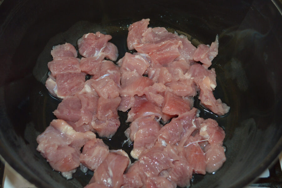 - Wash the pork and cut it into small pieces. Place the meat in a pot without oil and turn on the stove to medium heat.