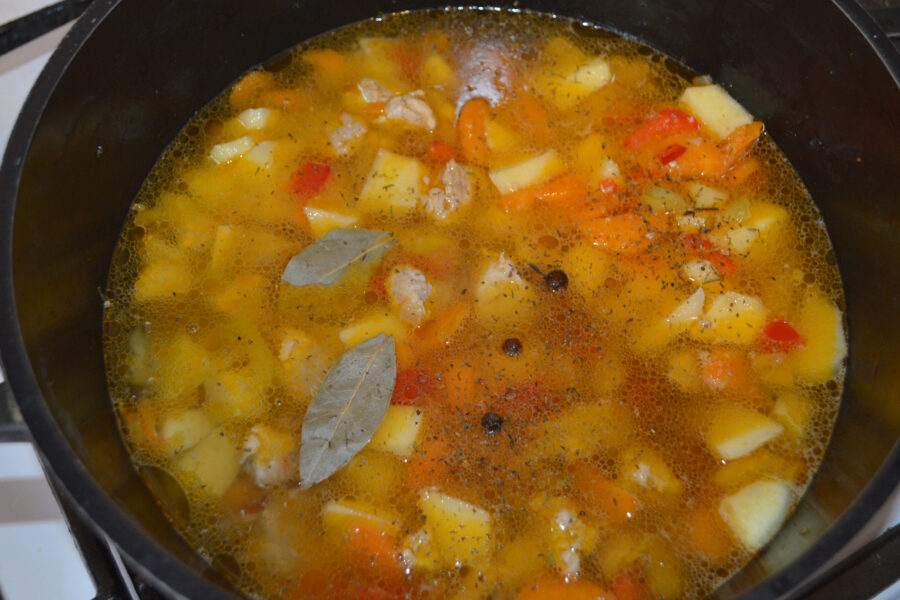 - Sprinkle with salt, thyme, and add bay leaves and aromatic peppercorns. Cover and cook over low heat for 50-60 minutes.