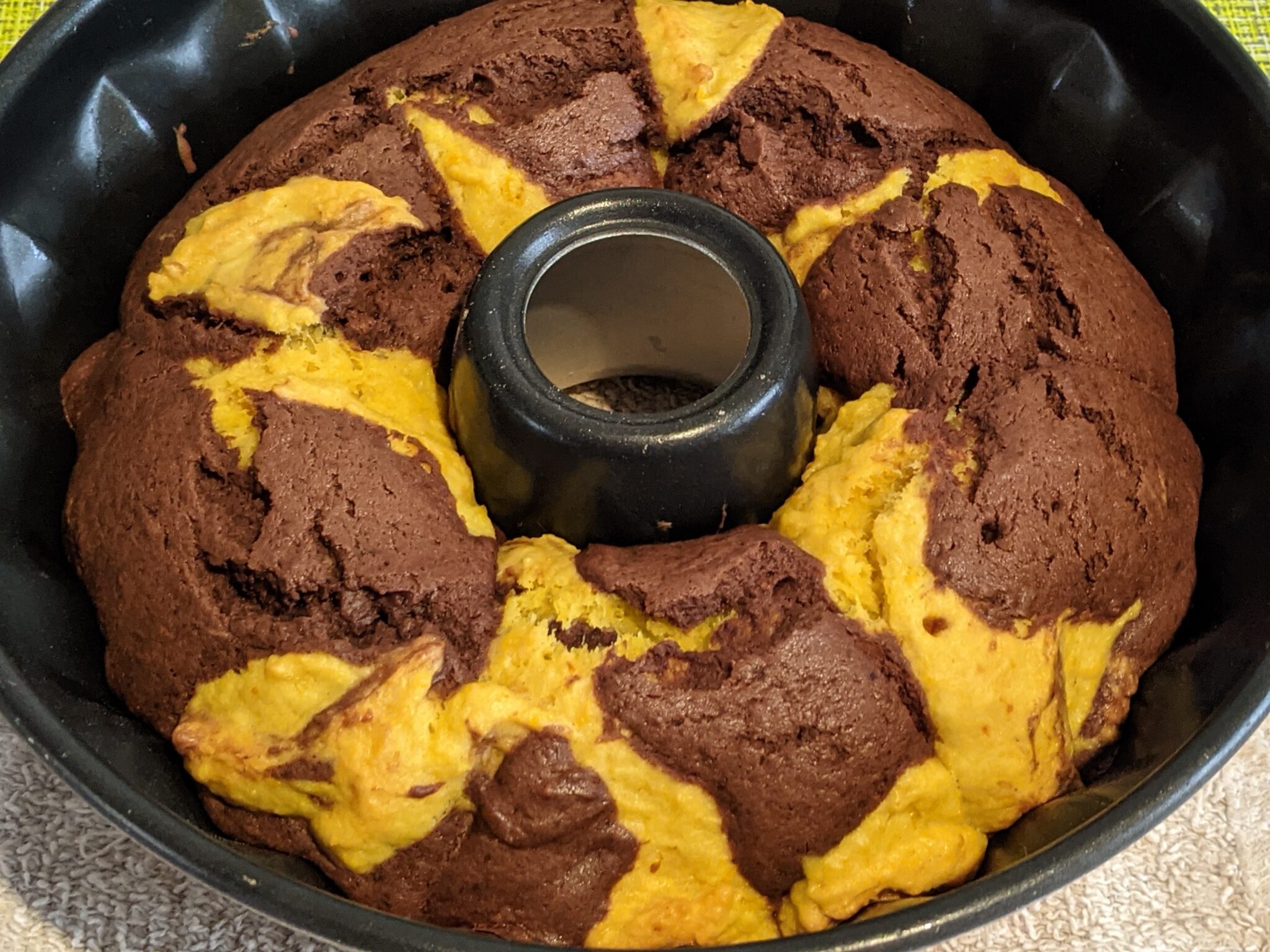 Distribute the dough in the baking mold, alternating between the chocolate and yellow dough.