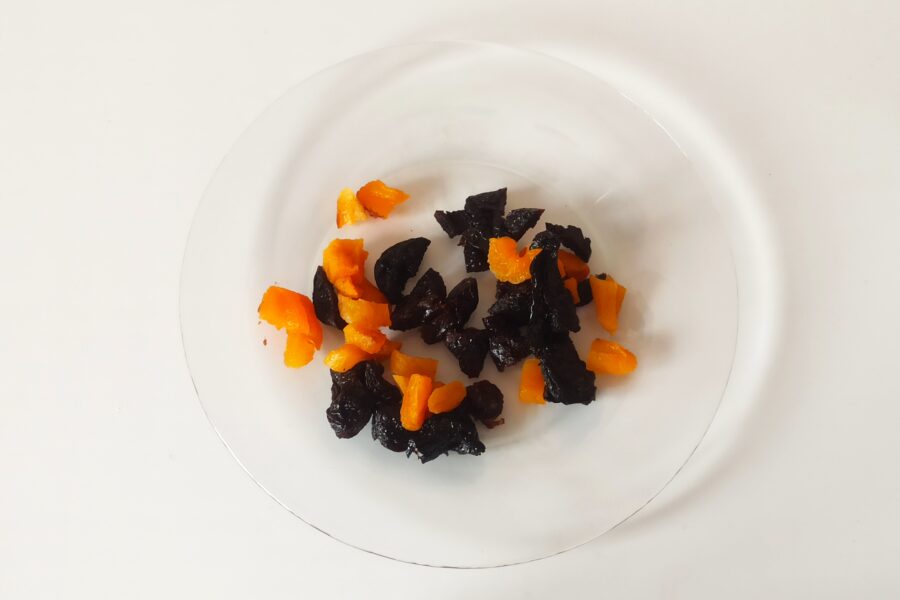 - Chop the plums and apricots finely.