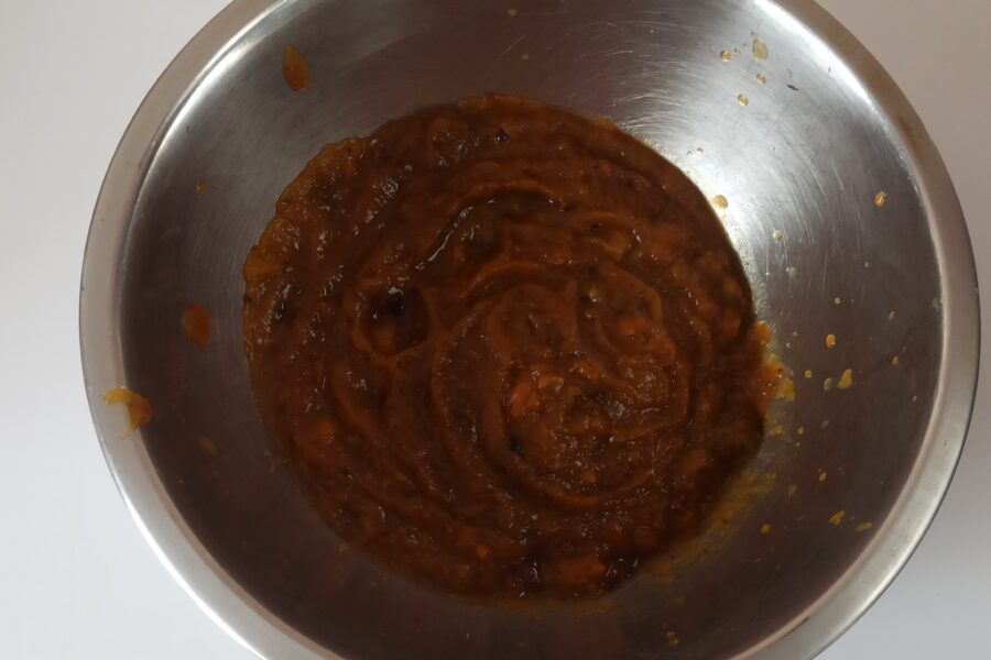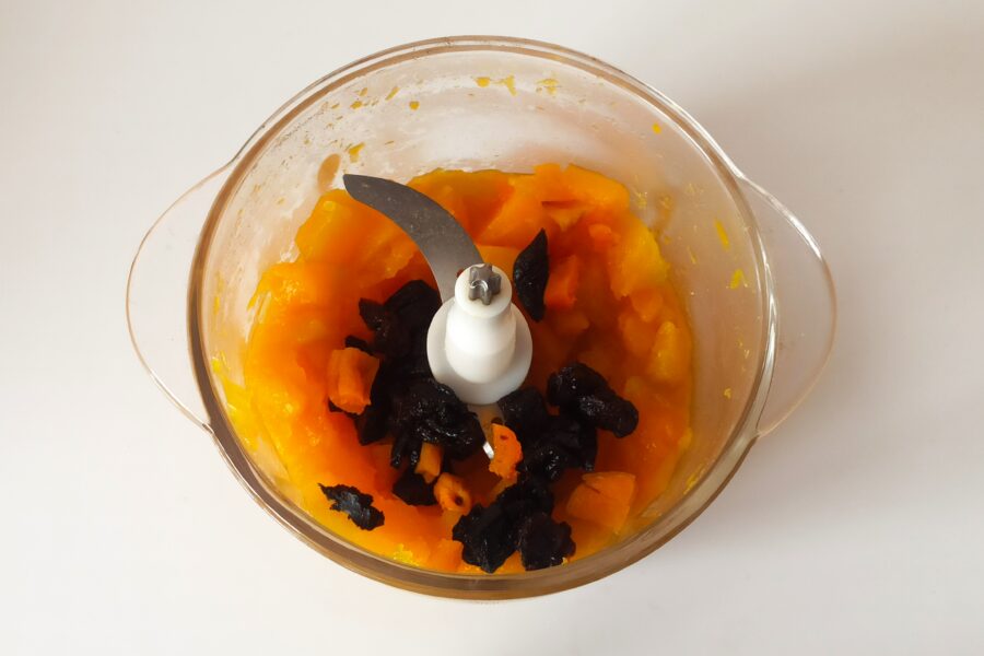 - Place the slightly cooled boiled pumpkin in the food processor bowl. Add the dried fruit to the same bowl and blend until you obtain a purée.