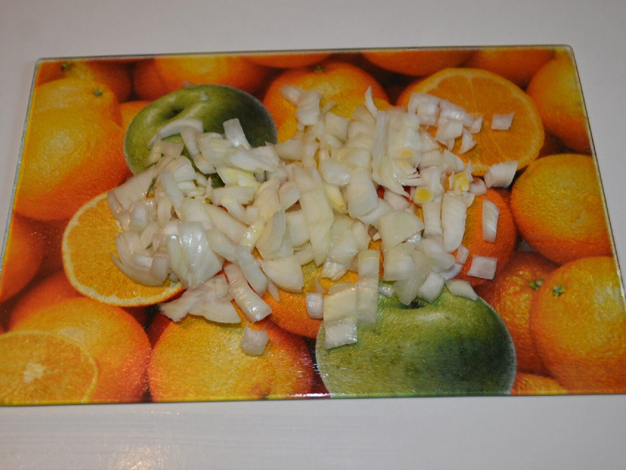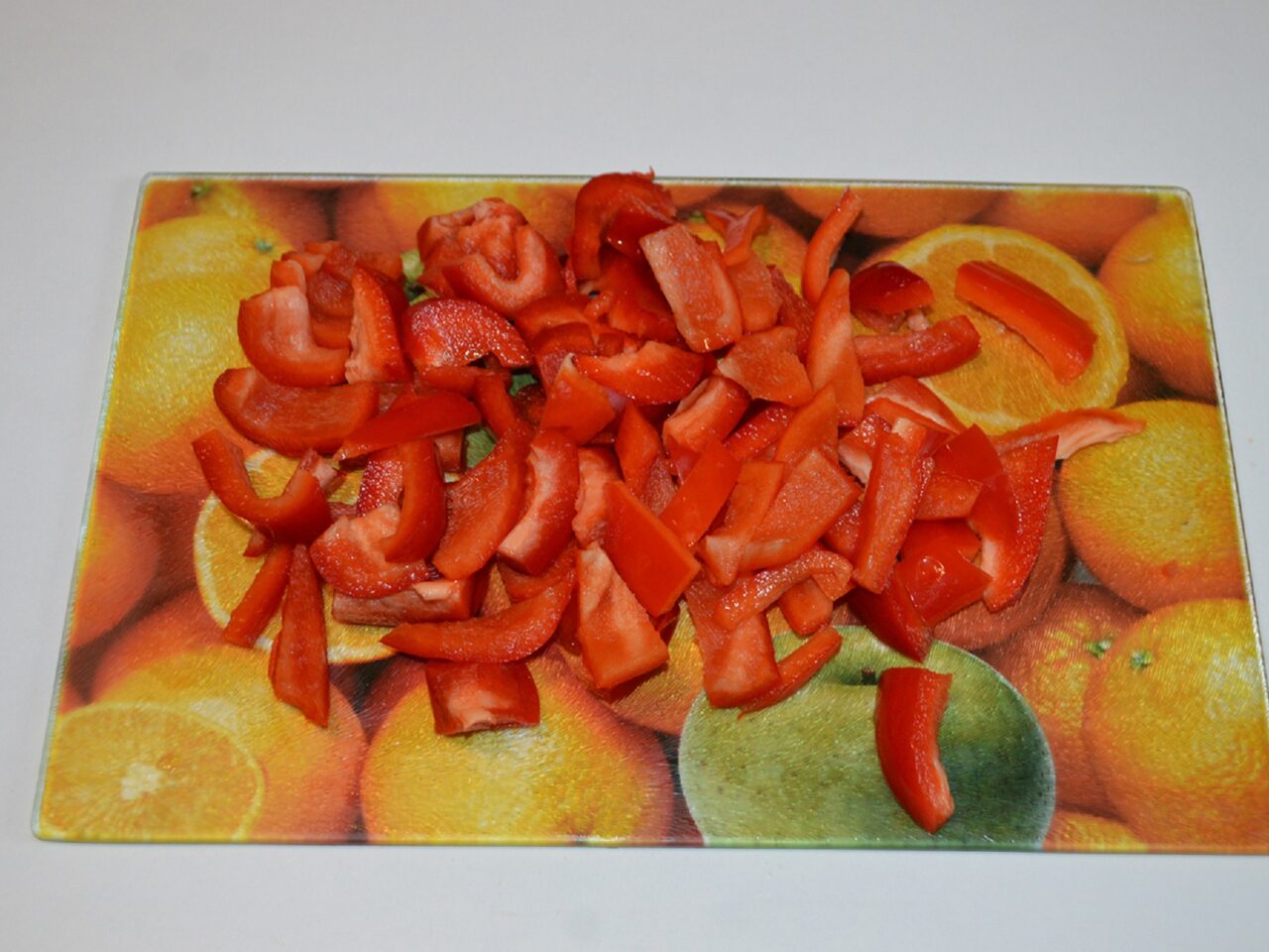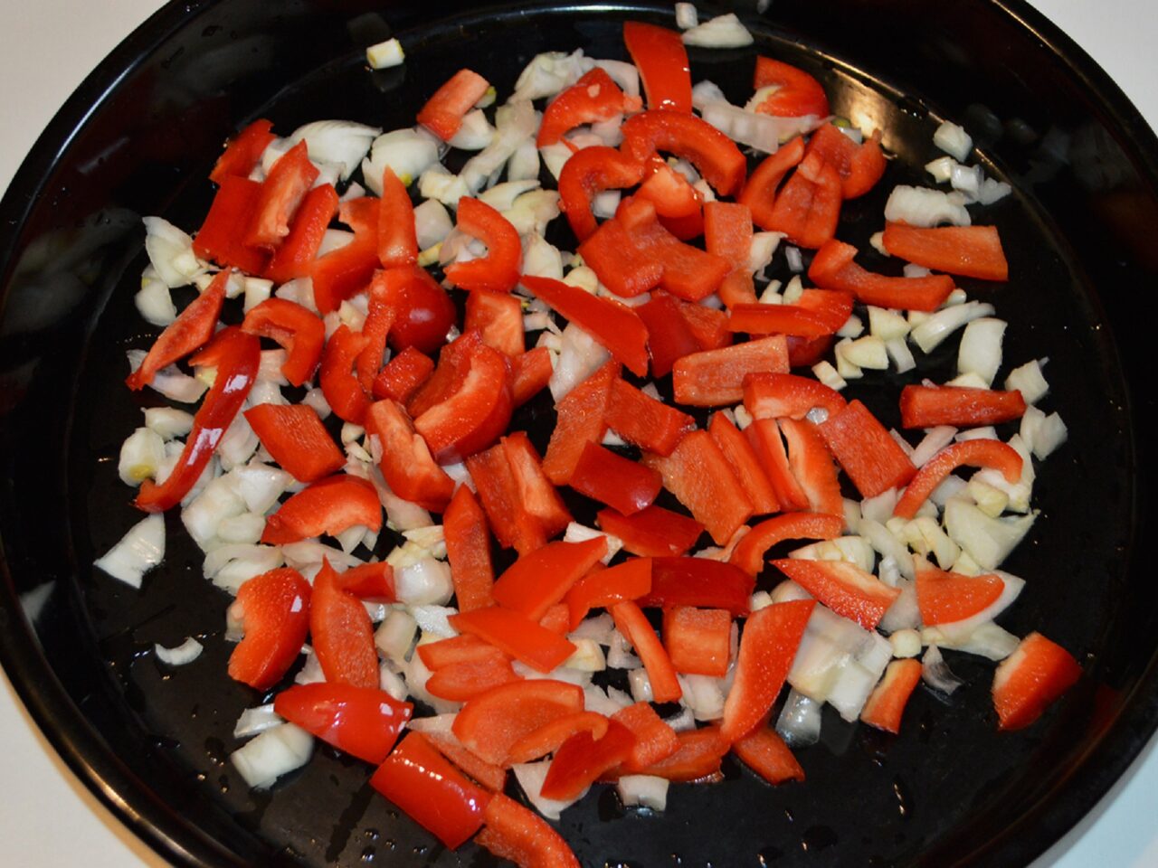 - Place the chopped onion, garlic, and bell pepper in a baking tray.
