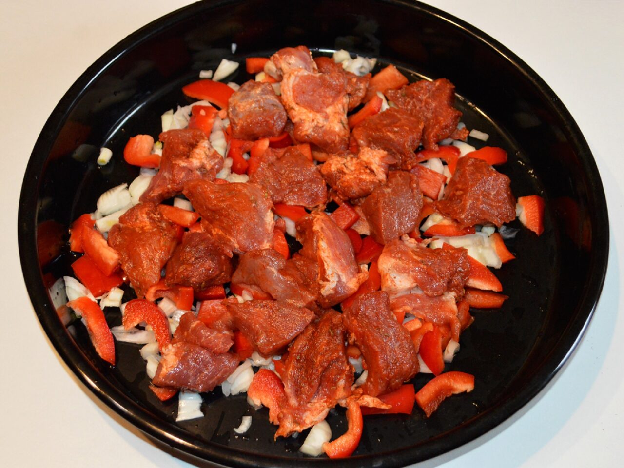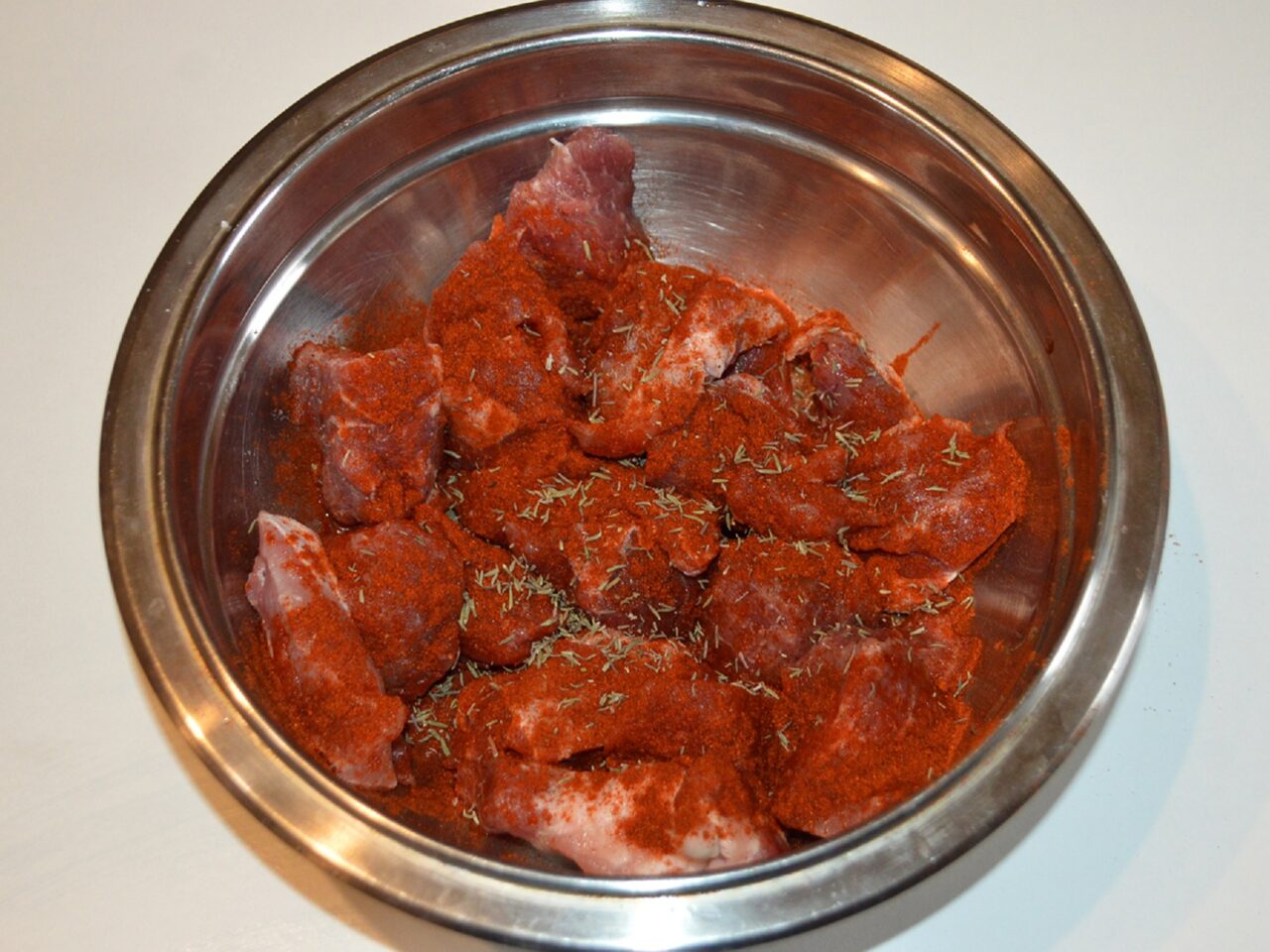 - Prepare the meat: first cut it into pieces, then sprinkle with salt, paprika, and thyme. Mix.
