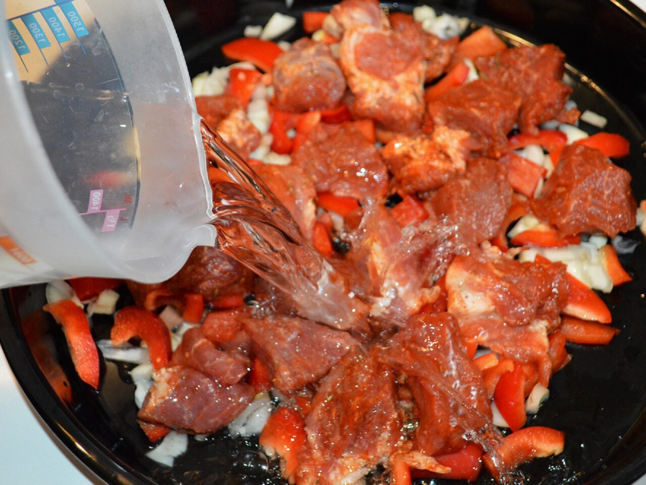 - Pour in enough water to cover the meat and vegetables. Cover the tray with aluminum foil and bake in a preheated oven at 190 degrees for 45 minutes.