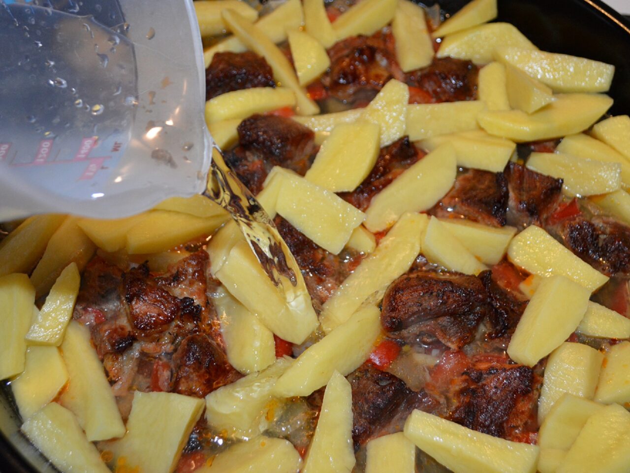 - After the set time, remove the tray from the oven and place the potatoes among the meat. Add some water and bake for one hour at 190 degrees Celsius. Ten minutes before it is ready, remove the aluminum foil so that the food browns a little.