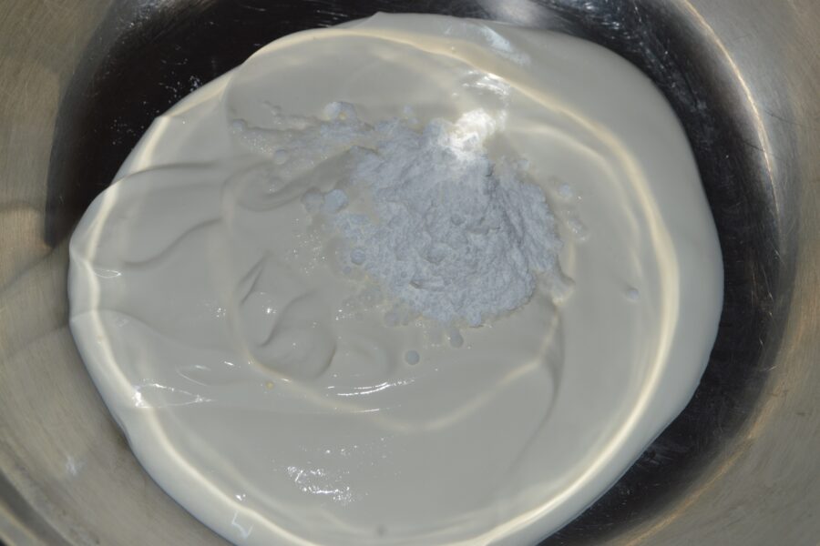 - Mix well with a whisk; air bubbles will form, which means that the baking powder is reacting with the cream.