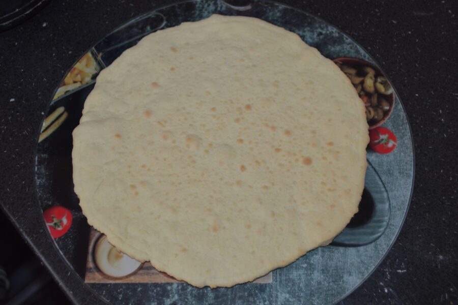 - Roll out the dough balls with a rolling pin, sprinkle a little flour underneath so they don’t stick to the table, and use a lid or a large, round plate to form a circle.