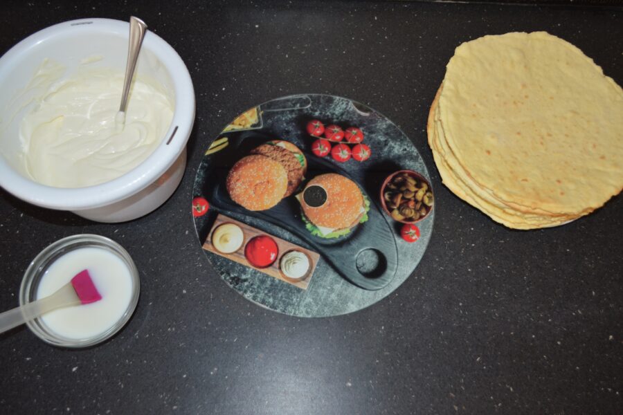 - Put a little cream on the plate, then place the sheet of dough on top. Brush each sheet with warm milk.