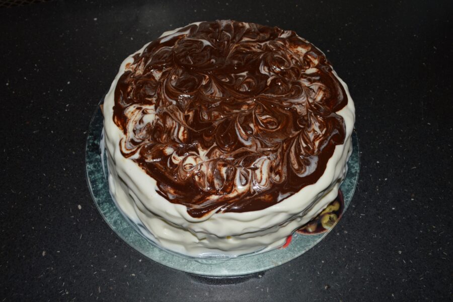 - Pour the glaze over the cake and spread it evenly with a spoon. Then use a wooden skewer to make small circles, or decorate as desired.