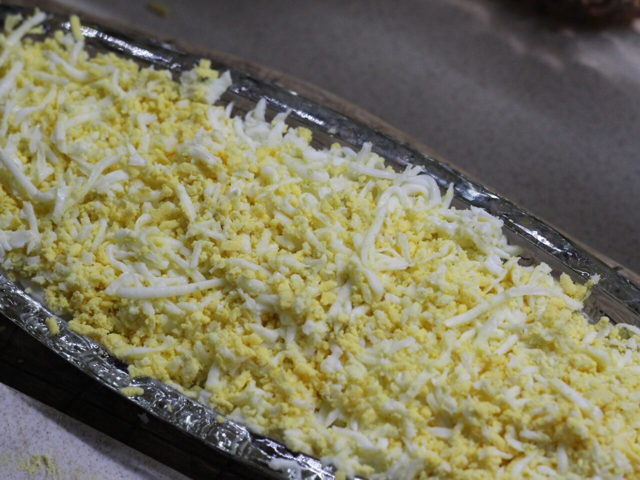 - Add the grated eggs and a tablespoon of mayonnaise to the next layer.