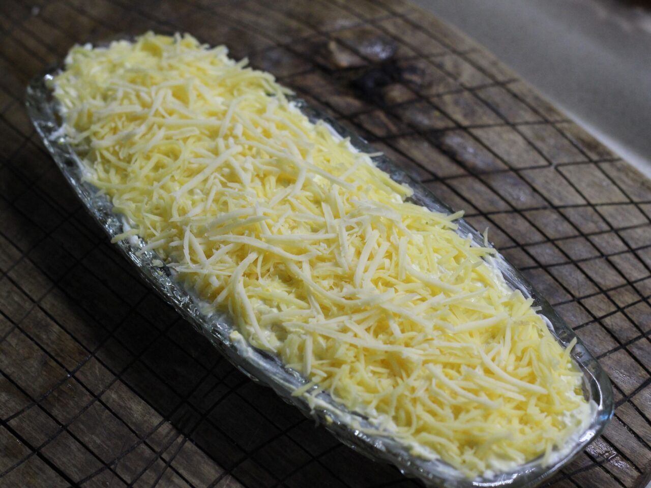 - Spread a thin layer of grated cheese. Coat the surface of the layer with mayonnaise.