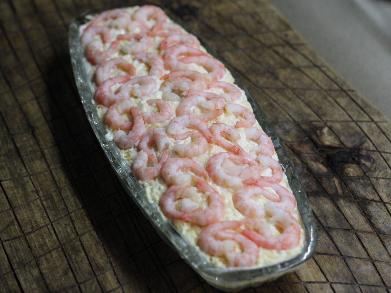 - Boil and peel the shrimp completely. Place the cooled seafood on top of the salad in a dense layer.
