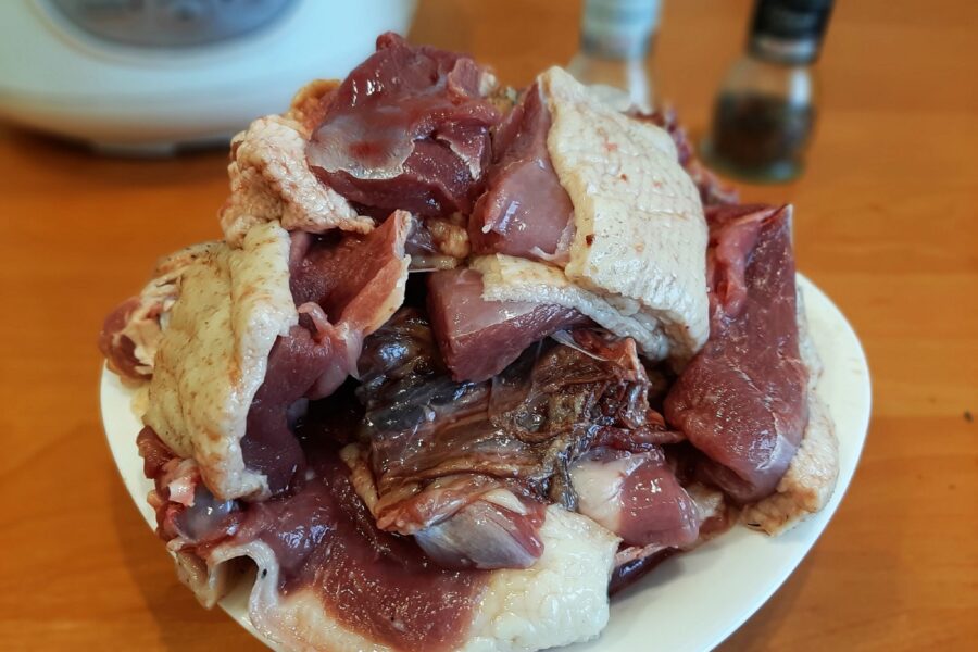 - Wash the duck thoroughly and remove any excess fat. Cut the meat into small pieces.