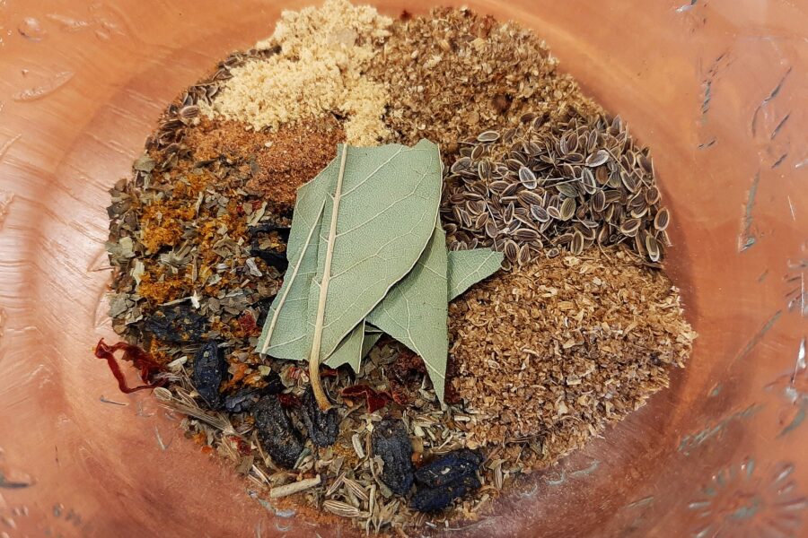 - Mix the spices in a deep bowl. To prepare this dish, you can use dill seeds, basil, cumin, barberry, paprika, bay leaves, black pepper, parsley, and marjoram. The composition can be adjusted to taste.