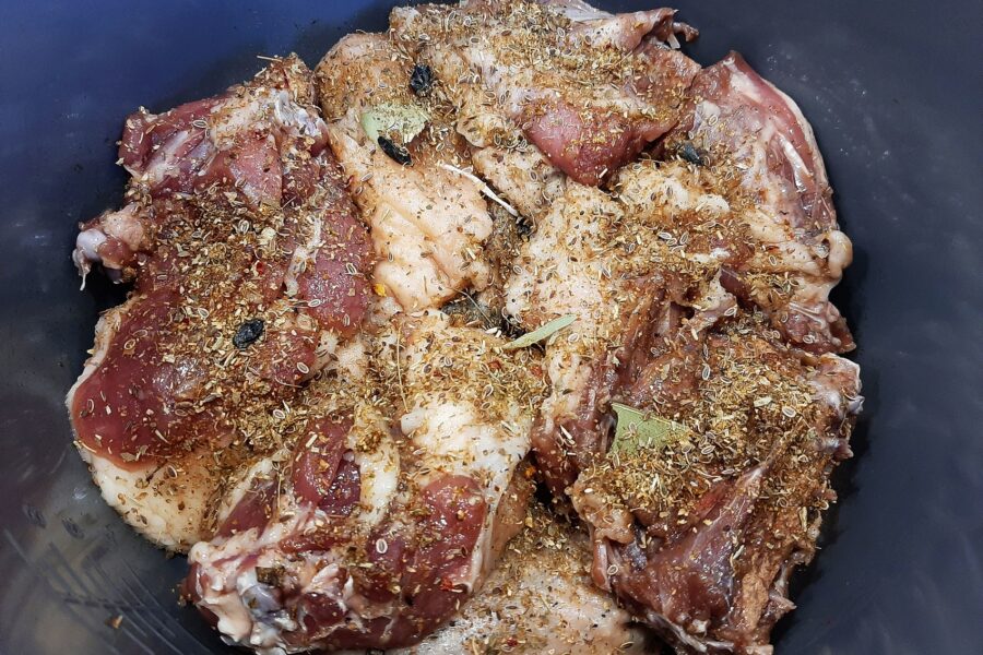 - Peel the garlic. Grate it finely or press it through a garlic press. Rub the duck pieces with salt and garlic.
