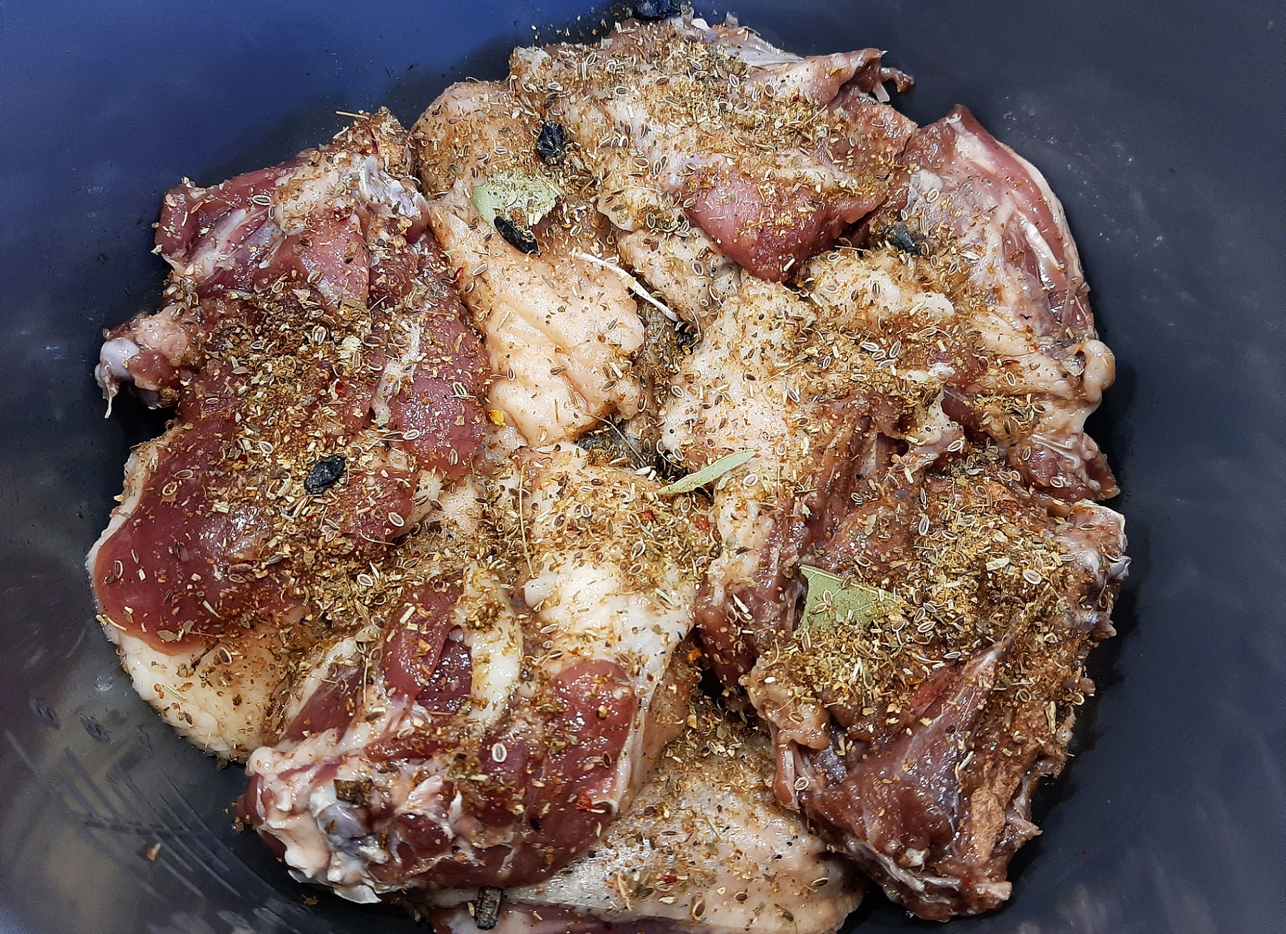 The recipe allows for some modifications. For example, those who enjoy spicy flavors may increase the amount of garlic, add more hot spices, and place chopped fresh onions between the layers of meat during marinating.