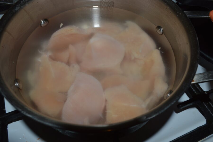 - Cut the chicken breast into large pieces and boil it separately in a small saucepan. Boil until foam rises to the top. Then remove the meat and rinse it in several changes of water.