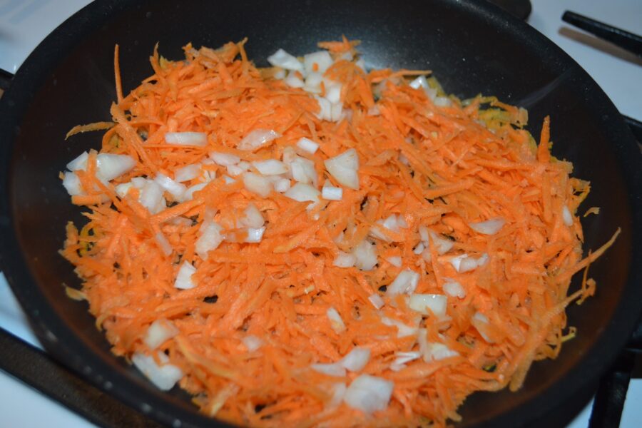 - In a hot pan with olive oil, fry the diced onion with the grated carrot.
