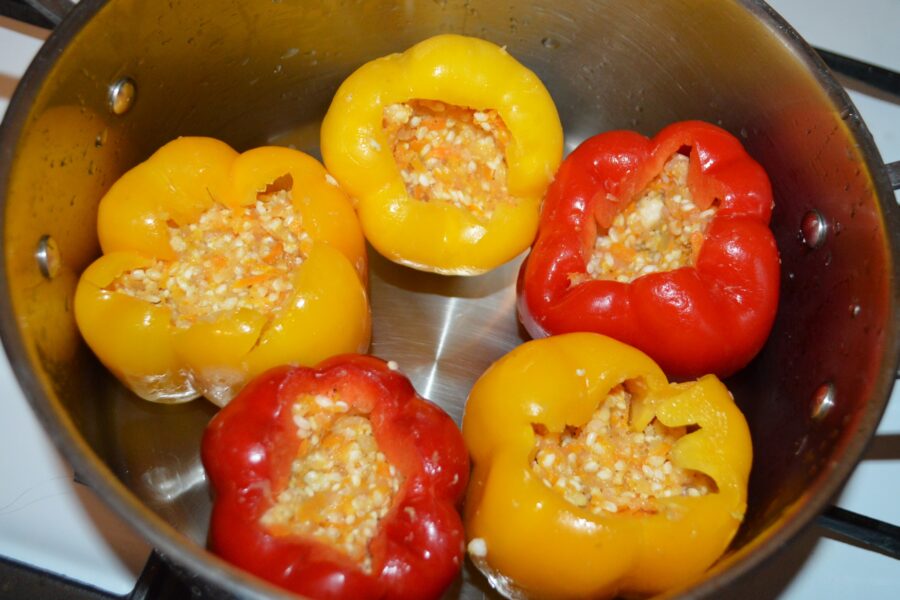 - Pour the mixture of water and sauce into the saucepan with the stuffed peppers. Pour in enough water to cover the peppers. Cook the peppers over low heat for one hour and 10 minutes. If the water level drops significantly during cooking, add a little more water to cover the peppers.