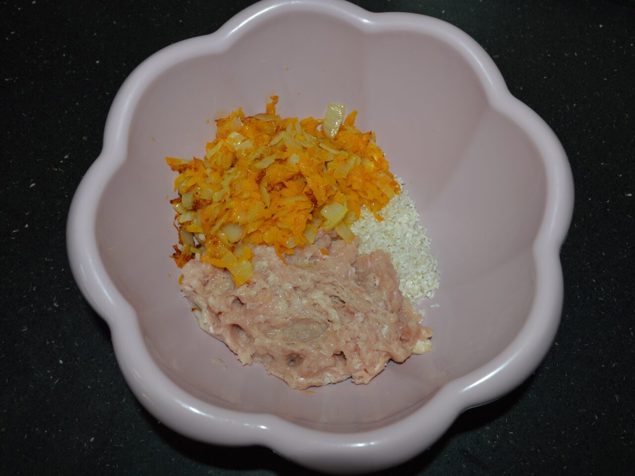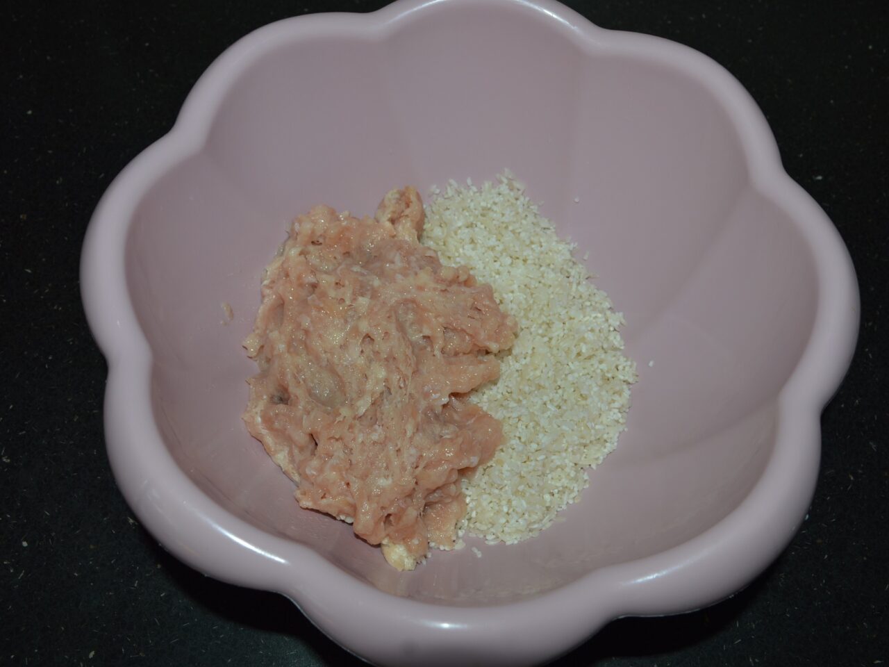 - In a large bowl, place the washed rice and minced meat.