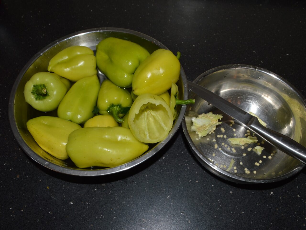 - Cut off the top of the pepper and remove the seeds from inside. Keep the top, you will need it for simmering.