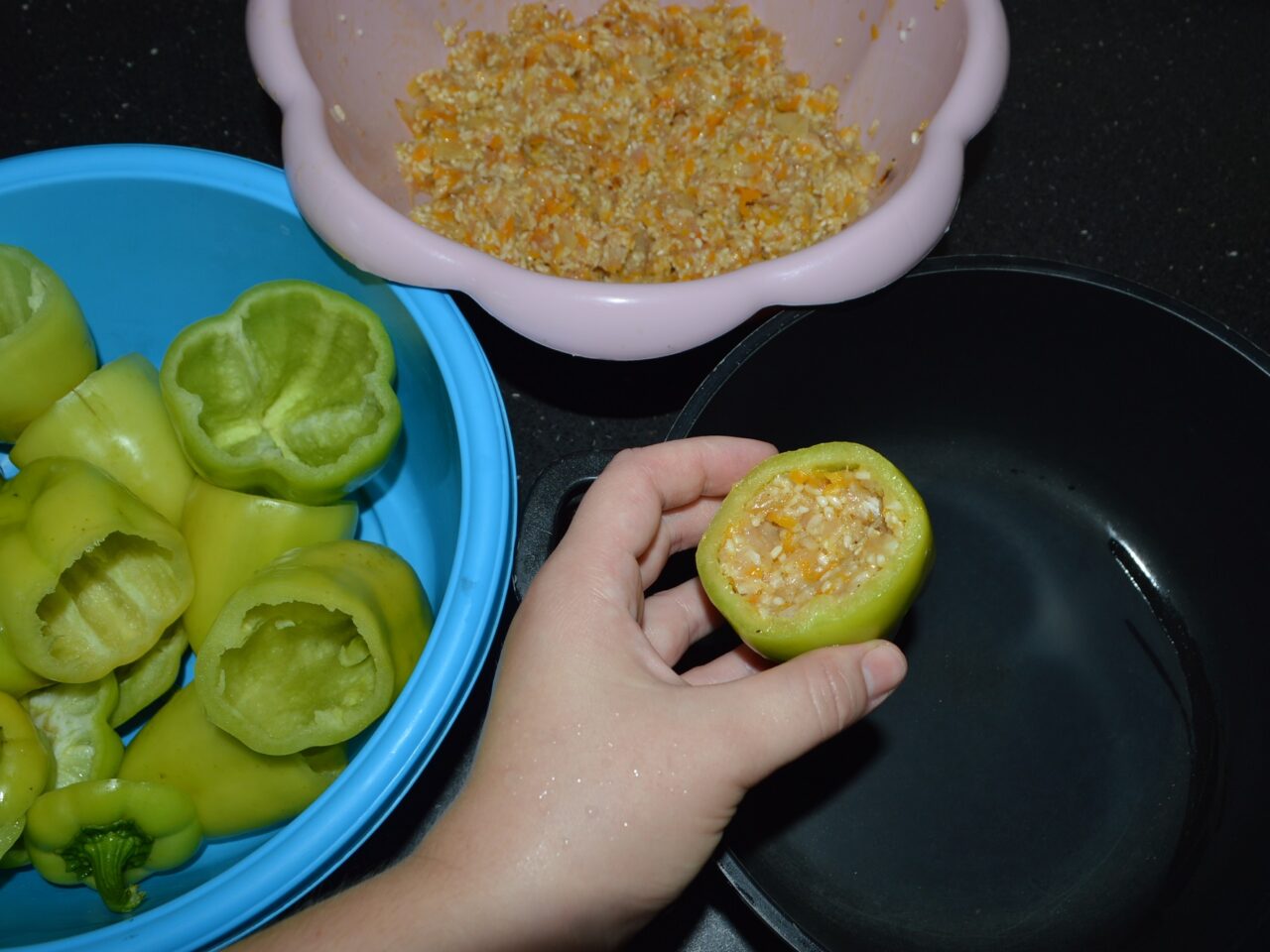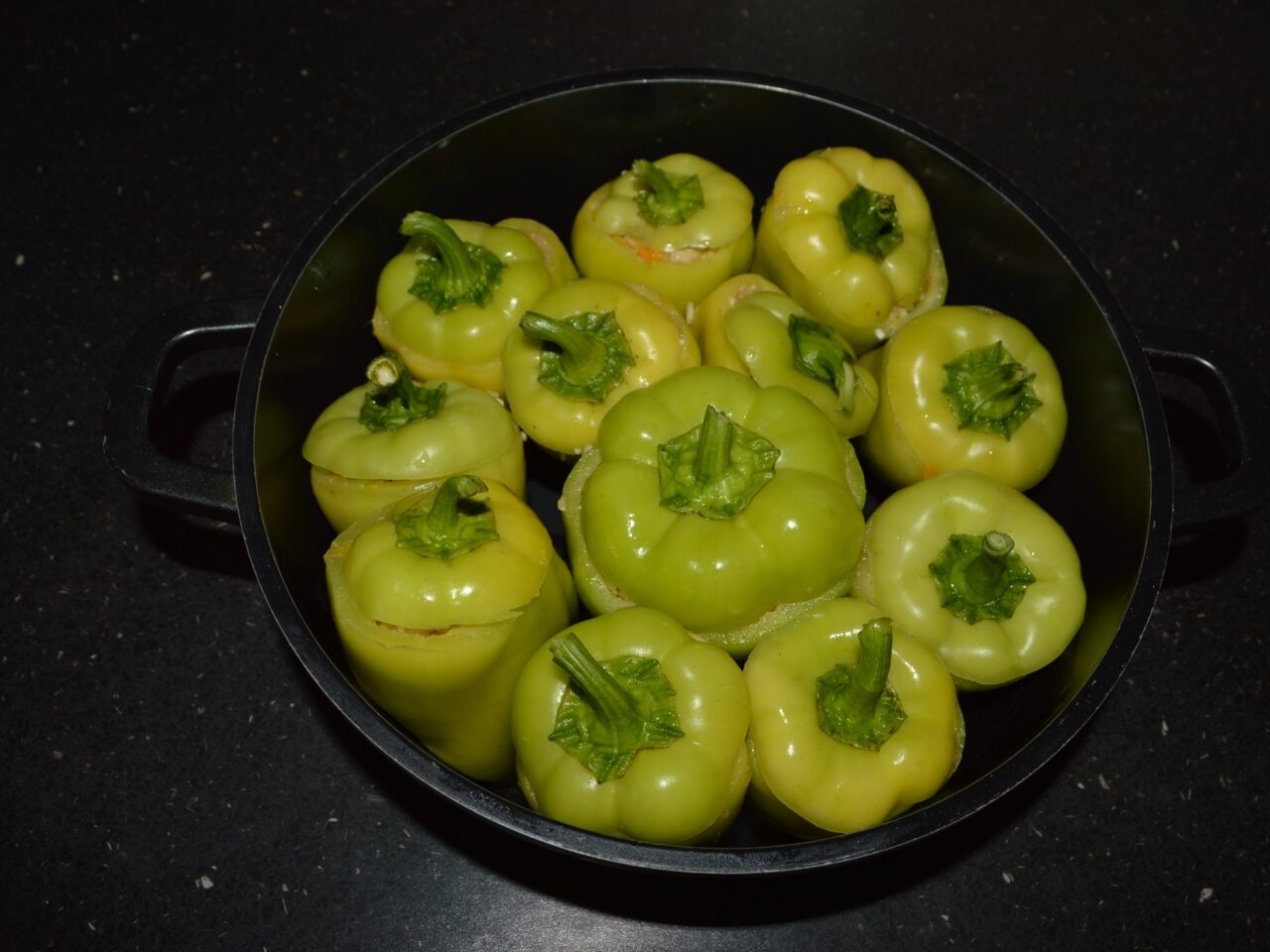 - Arrange the stuffed peppers in a pot, facing upwards.