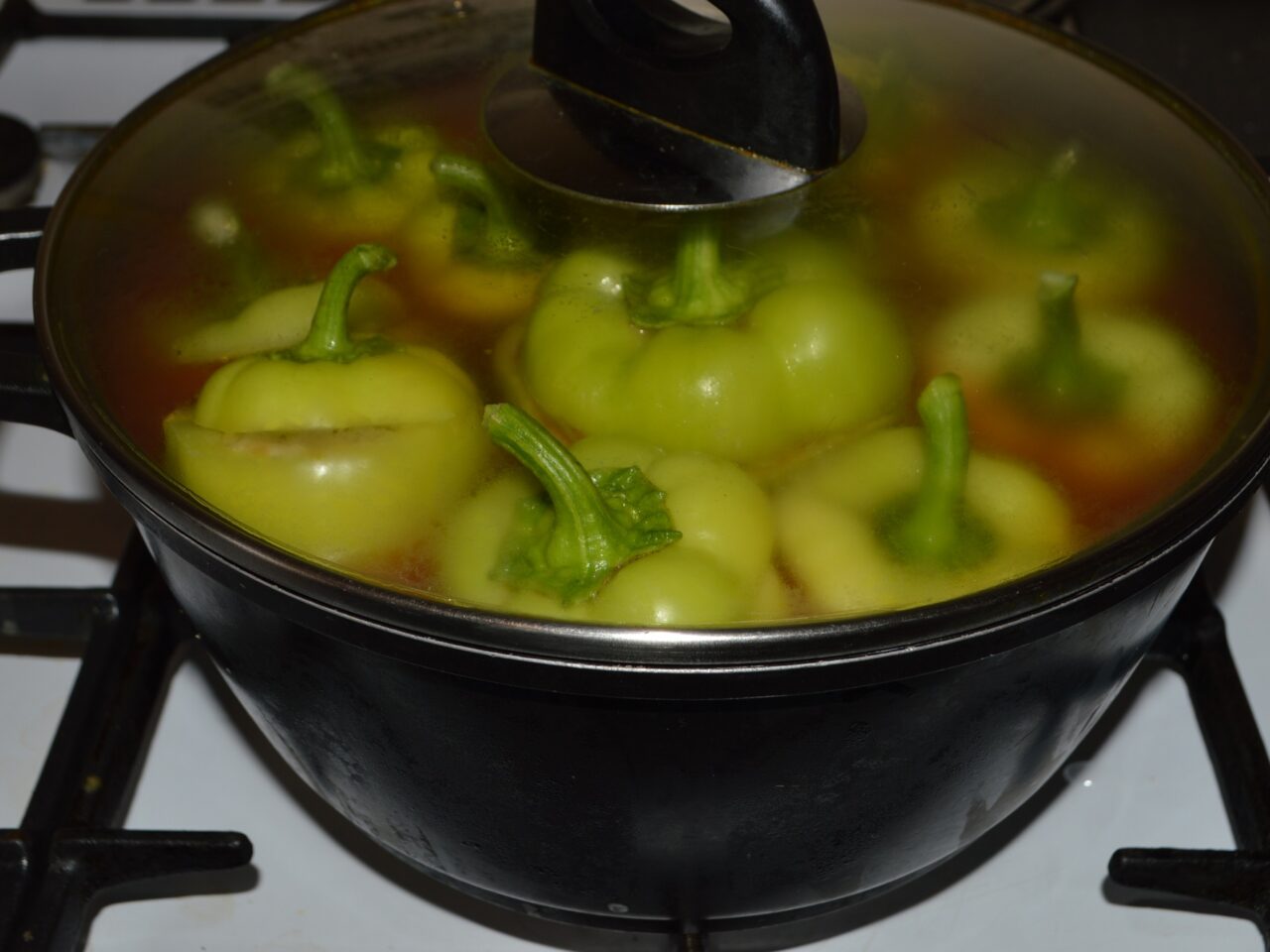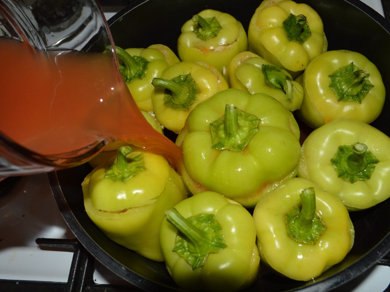 - Pour the mixture of water and tomato juice into the pot with the stuffed peppers, enough to cover them.