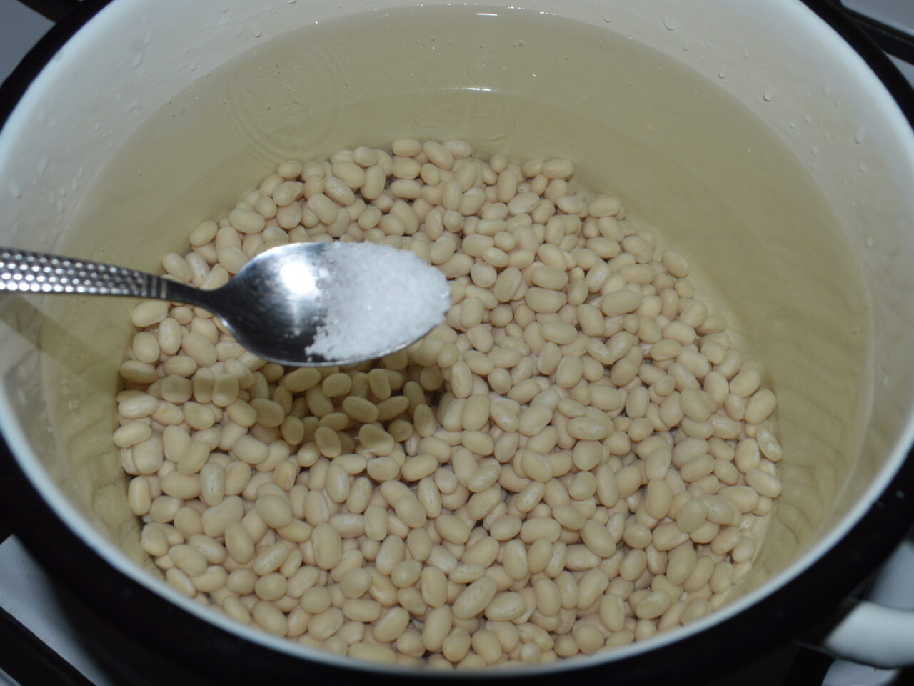 - Pour the water into a saucepan and add the beans. Turn on the heat and add half a teaspoon of salt.