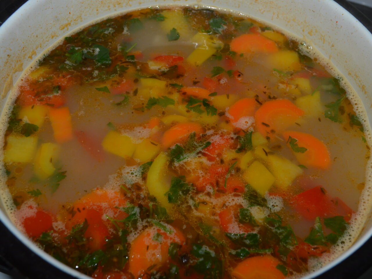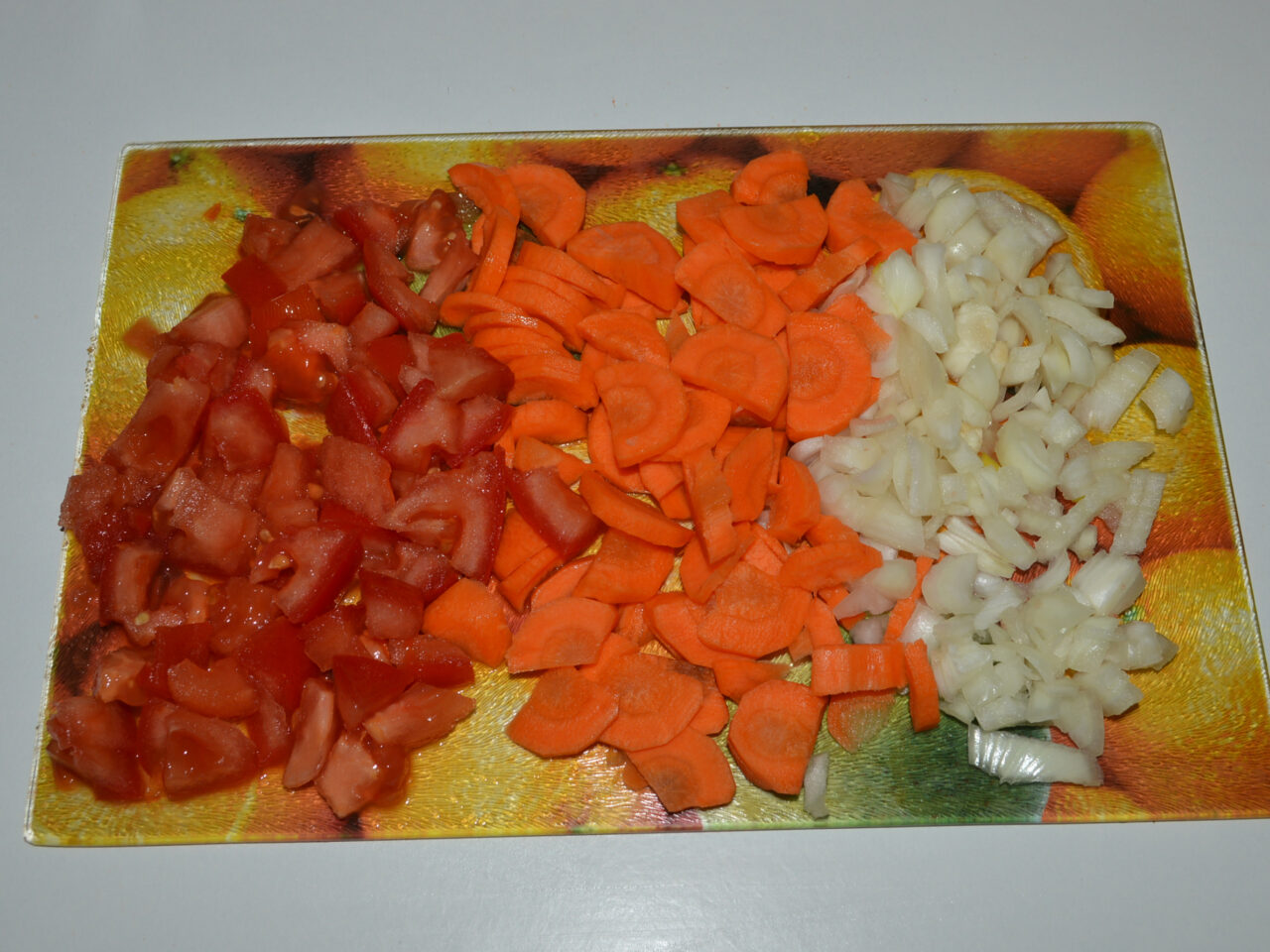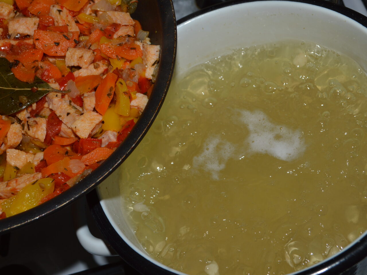 - Once the beans have started boiling in clean water, pour the pan with vegetables and meat.