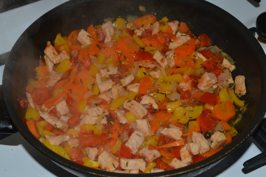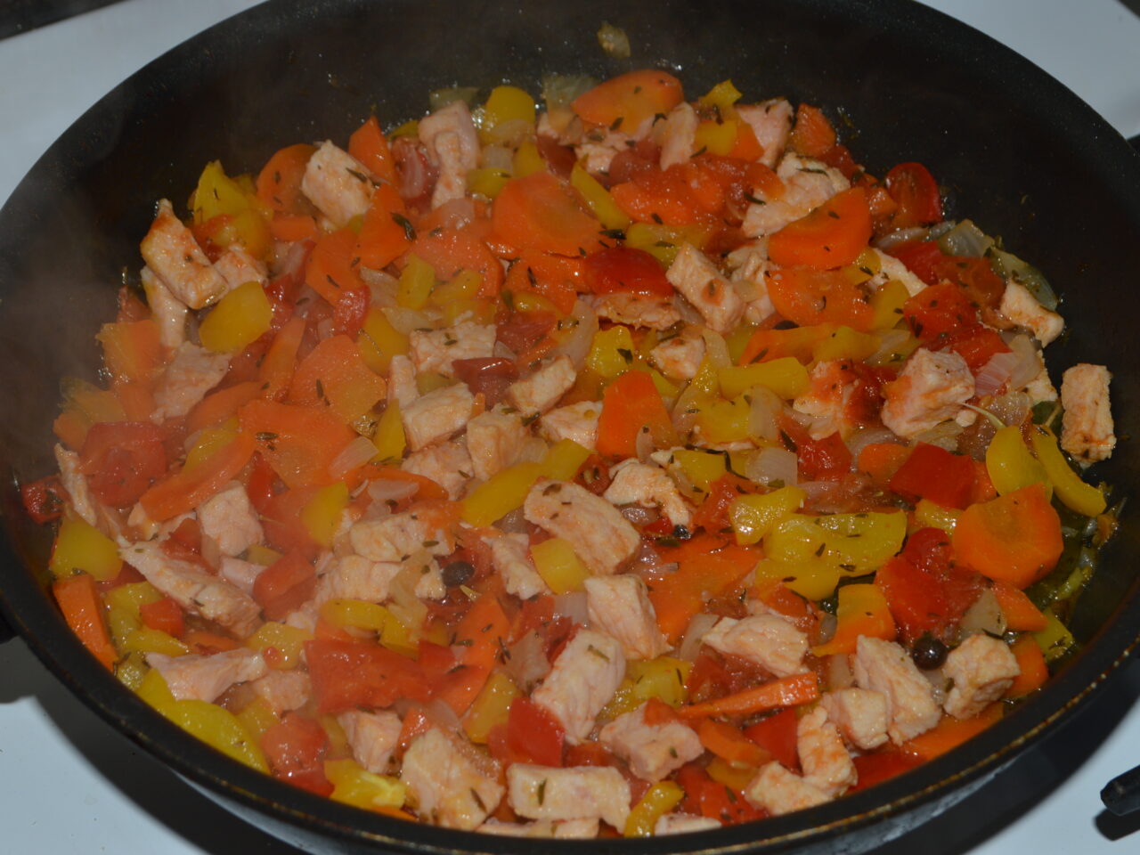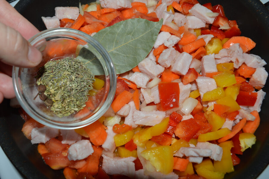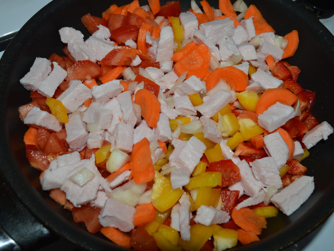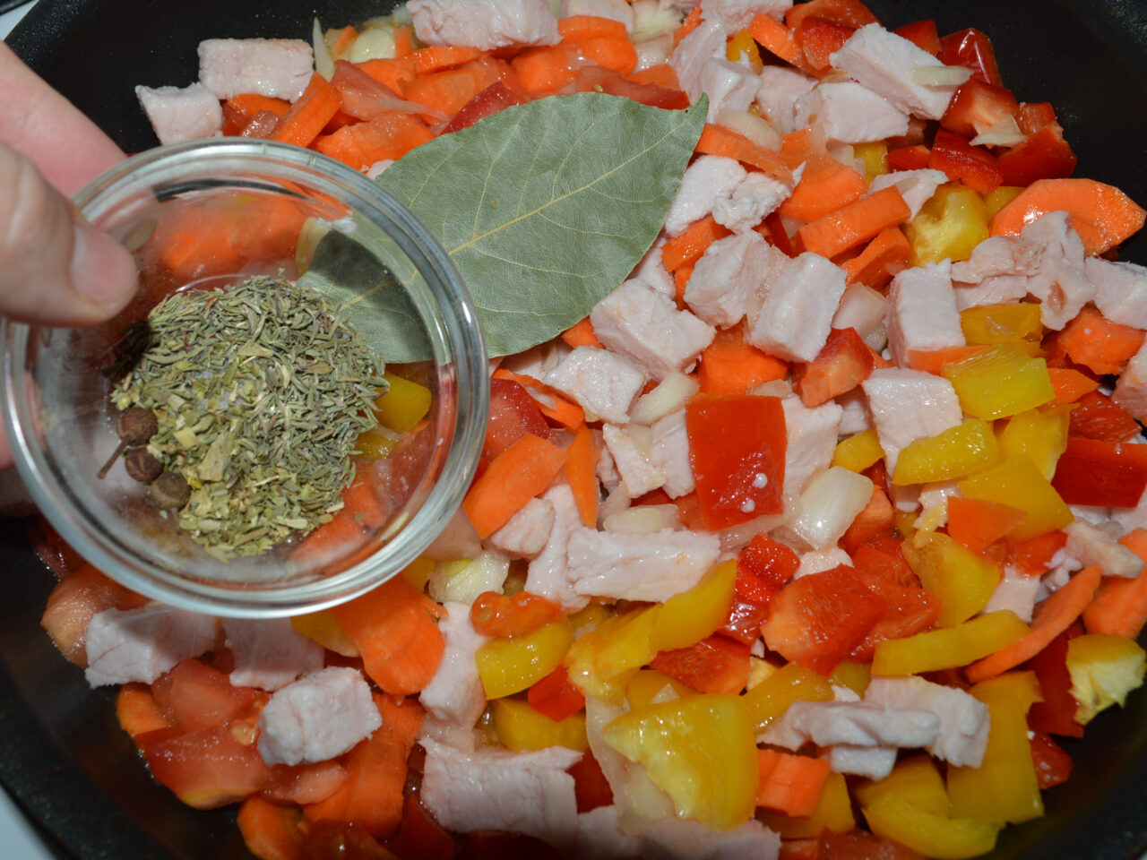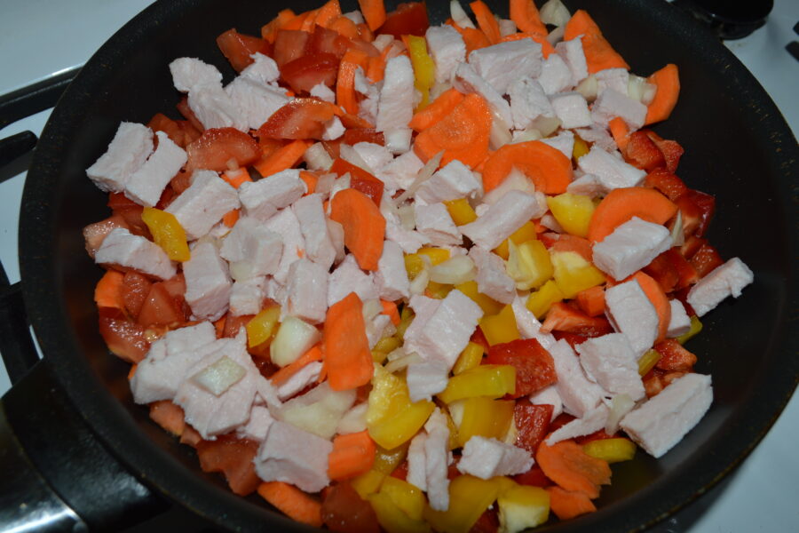 - Add the vegetables and meat to a hot pan with oil. Cook over low heat for 15 minutes.