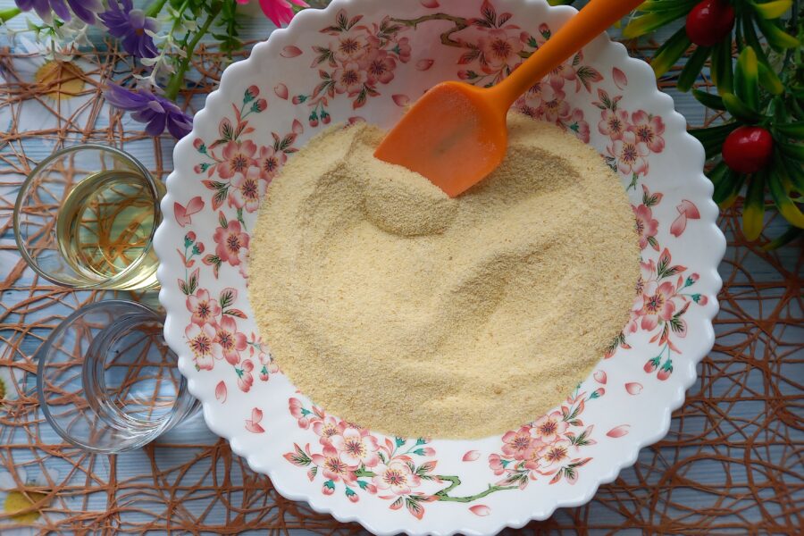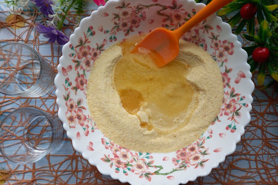 - This is necessary so that the dry ingredients (primarily the semolina) absorb moisture and swell. In the meantime, turn on the oven. It needs to be heated to 180 °C.