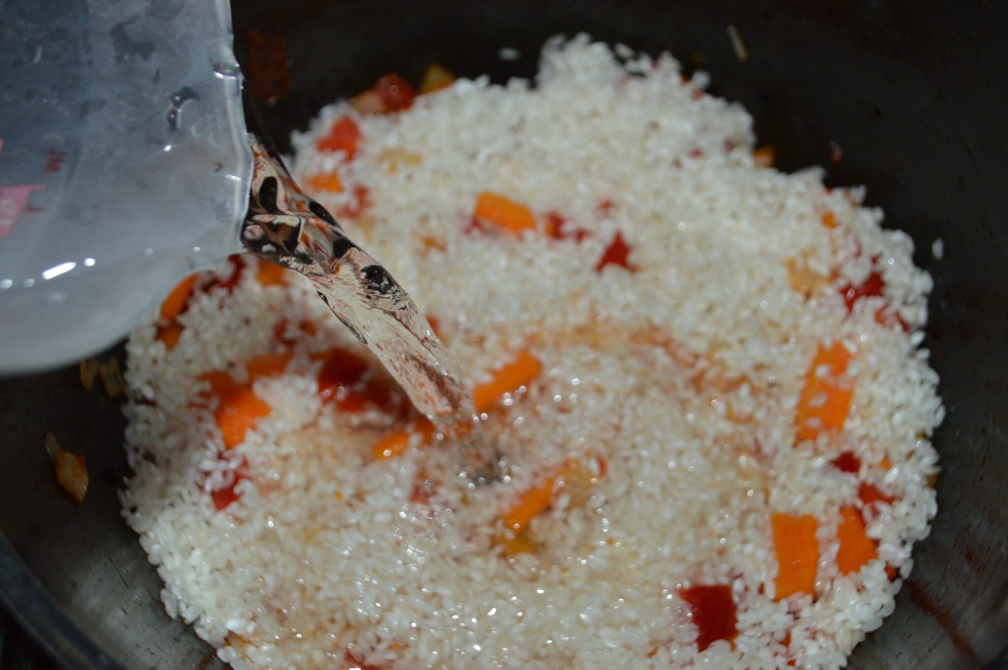 - Wash the rice in several changes of water until the last water runs clear, about 7-8 washes. Add the rice to the vegetables in the pot.